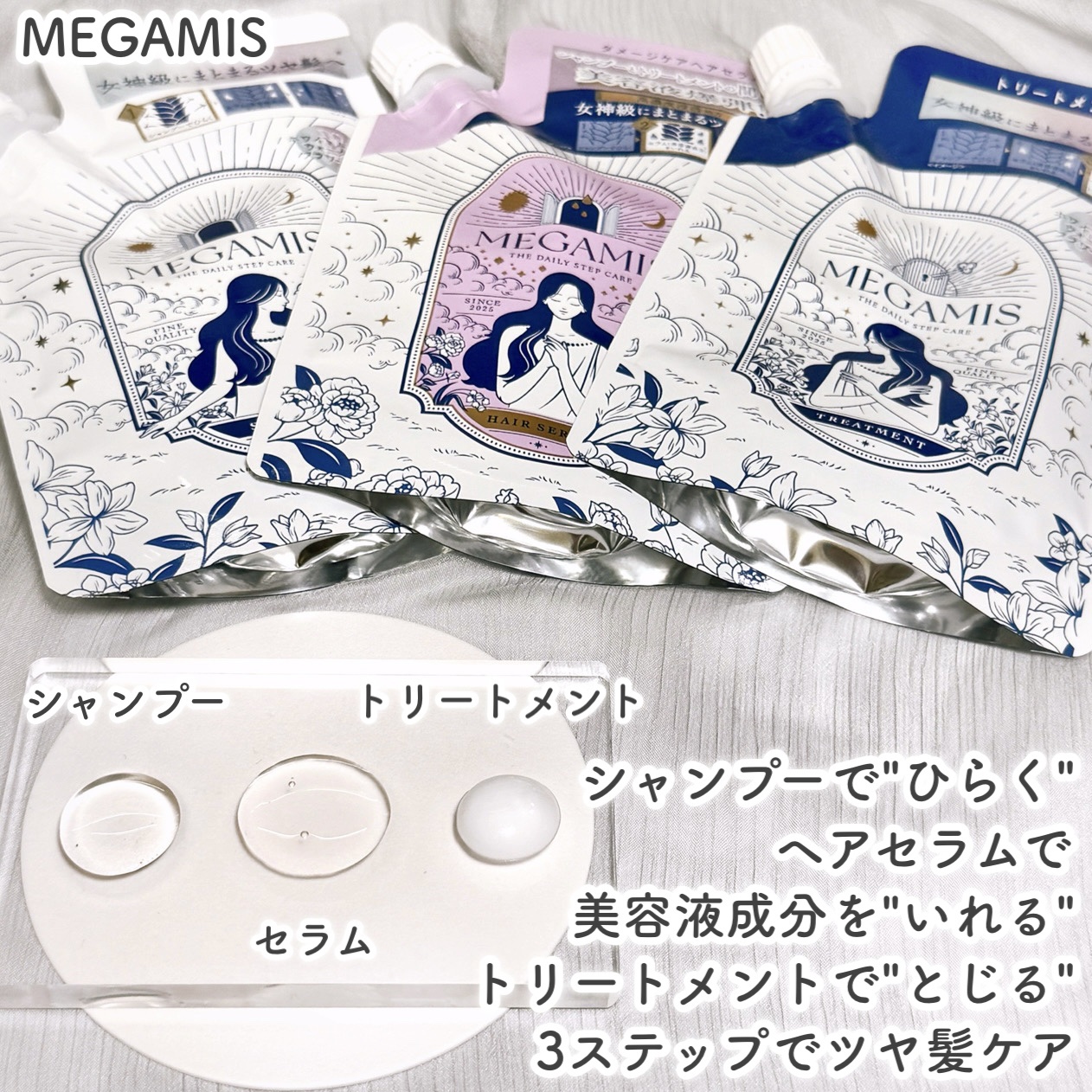 ウェルシアで買えるオススメヘアケア紹介🫶✔︎MEGAMIS シャンプー/トリートメント/ヘアセラム→普段のヘアケアにプラスワン✨ 髪にも美容液を使う感覚でヘアセラムをプラス 艶っぽい印象にしたい時にオススメのヘアケアで パッケージも可愛く目を...