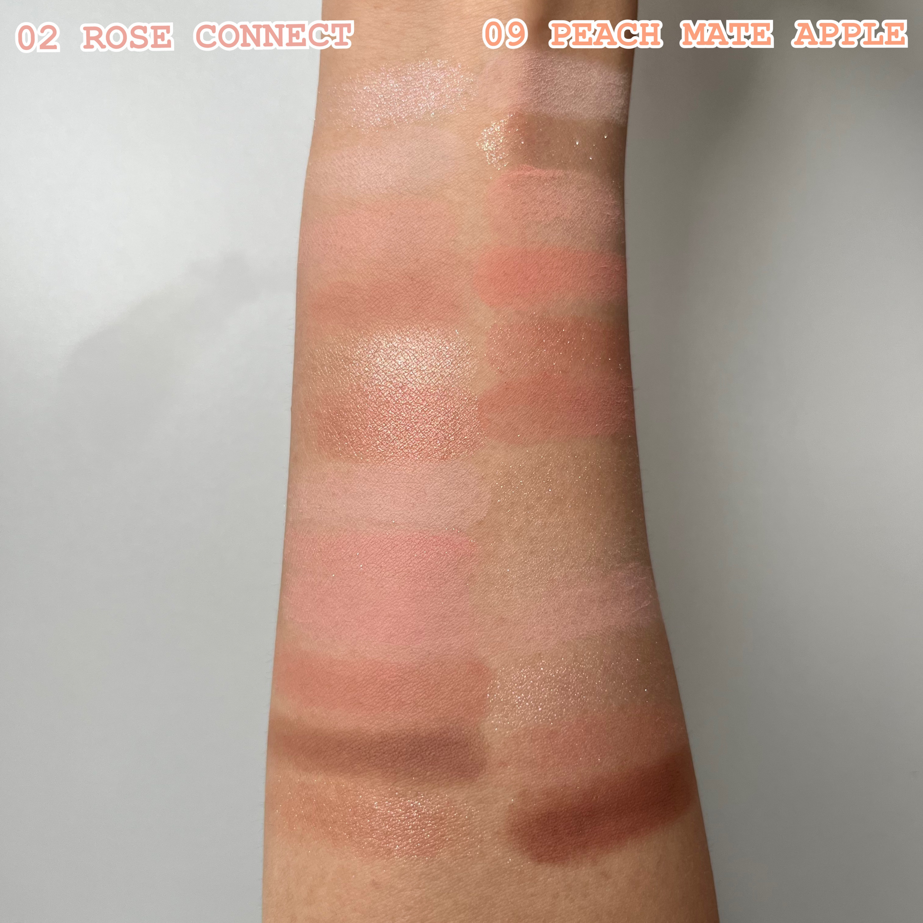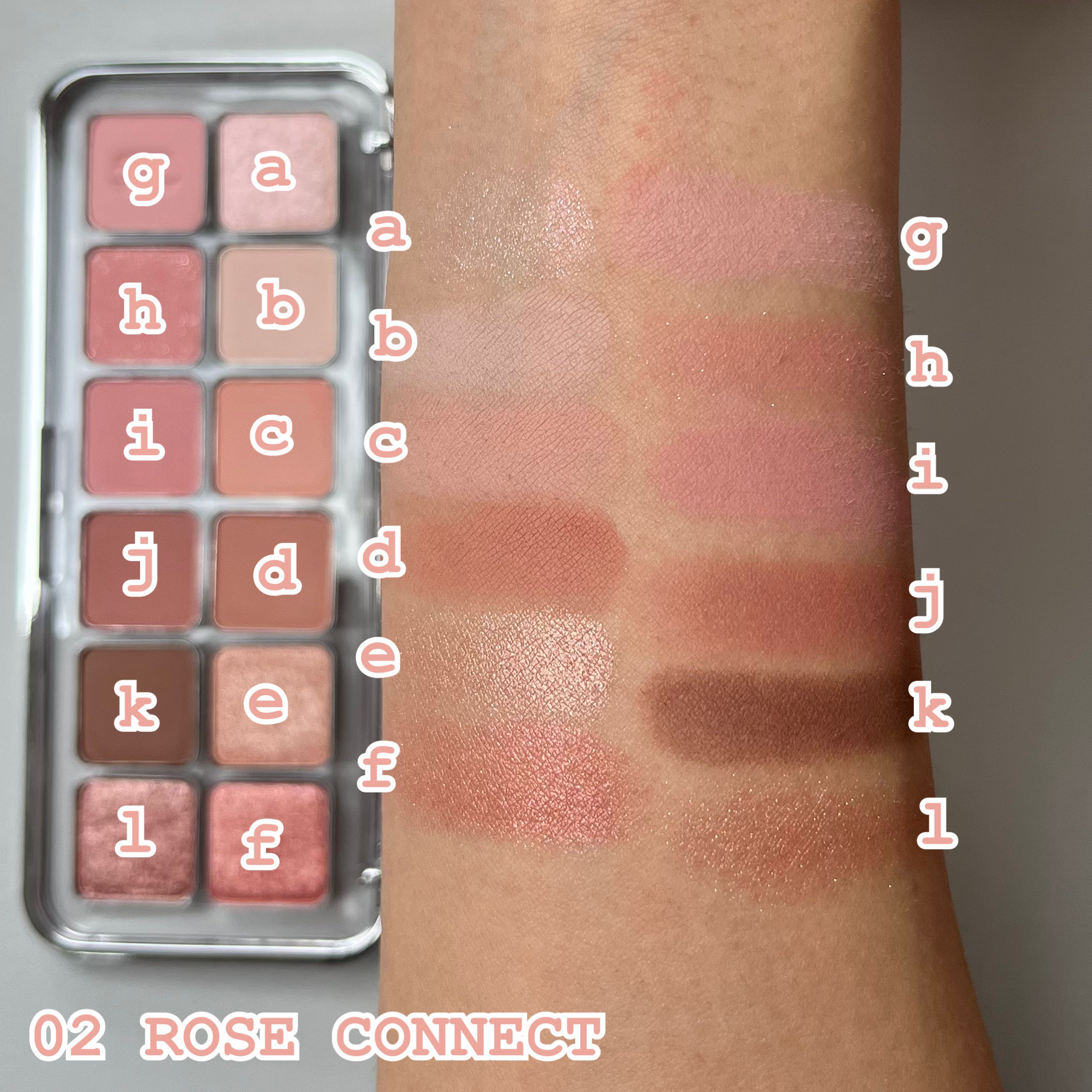 02ローズコネクトはいきいきとしたマチュアローズカラー! 青みはあまり感じない柔らかいピンクのパレット♡ 粉質、発色は安定の◯! 捨て色のない使いやすいパレットです♪ 可愛くて憧れのカンナギマロちゃんがYouTubeのメイク動画で使ってて、 しかも底見えパレットだったから秒でポチり!