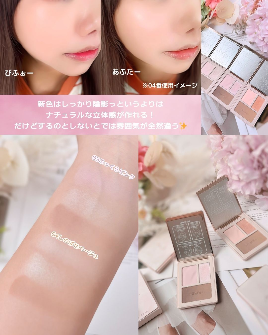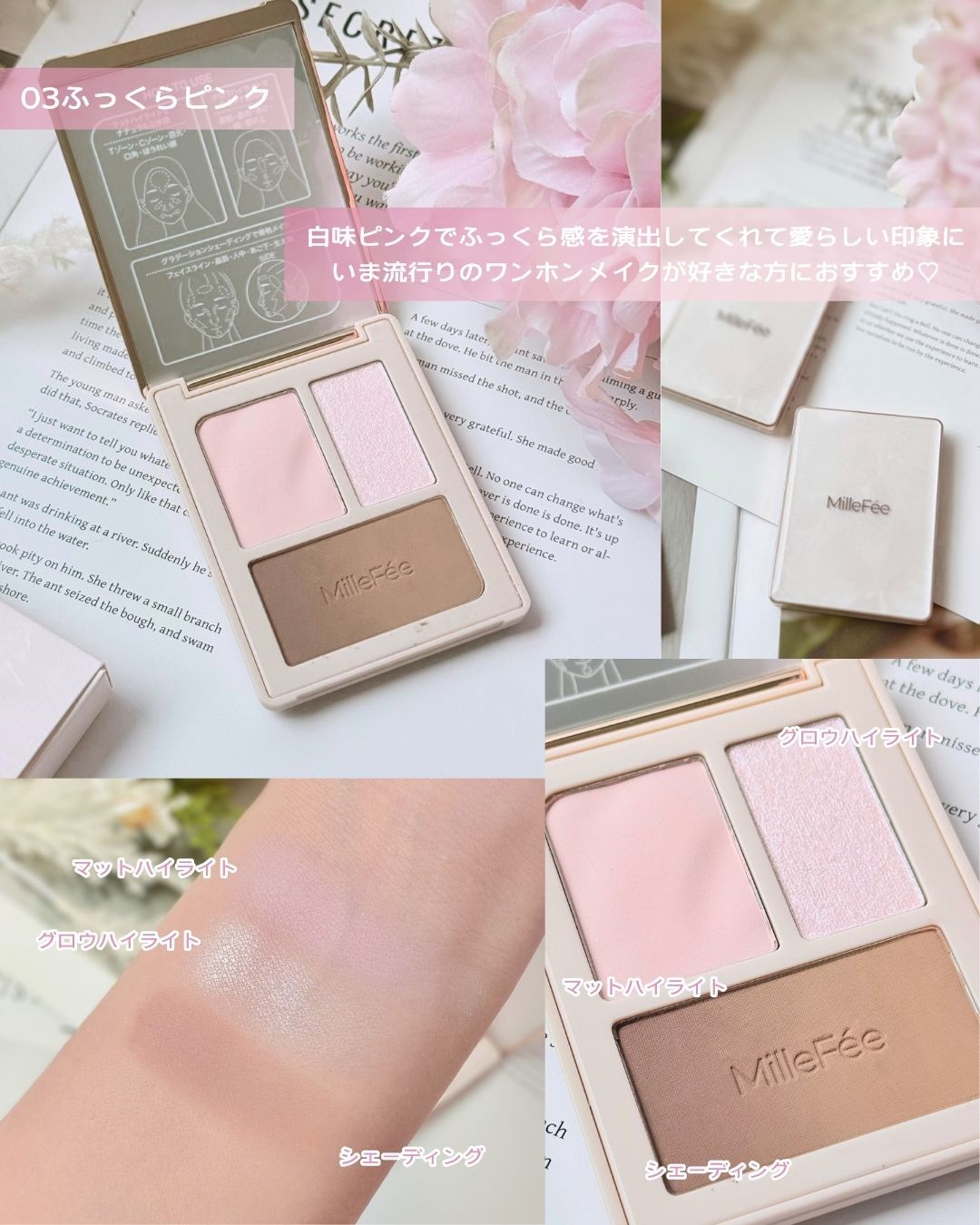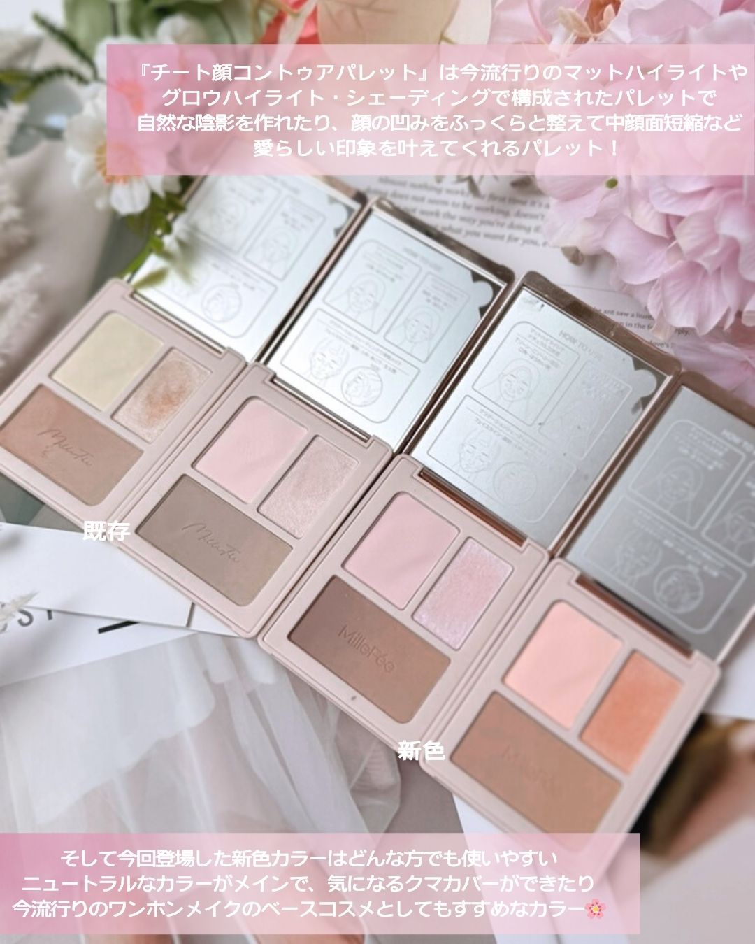 MilleFéeの大人気チート顔コントゥアパレットに新色2色が仲間入り!MilleFéeチート顔コントゥアパレット03ふっくらピンク04しのばせベージュ2種類のハイライトとグラデーションシェーディングで自然な立体感と中顔面短縮を叶えます。マッ...