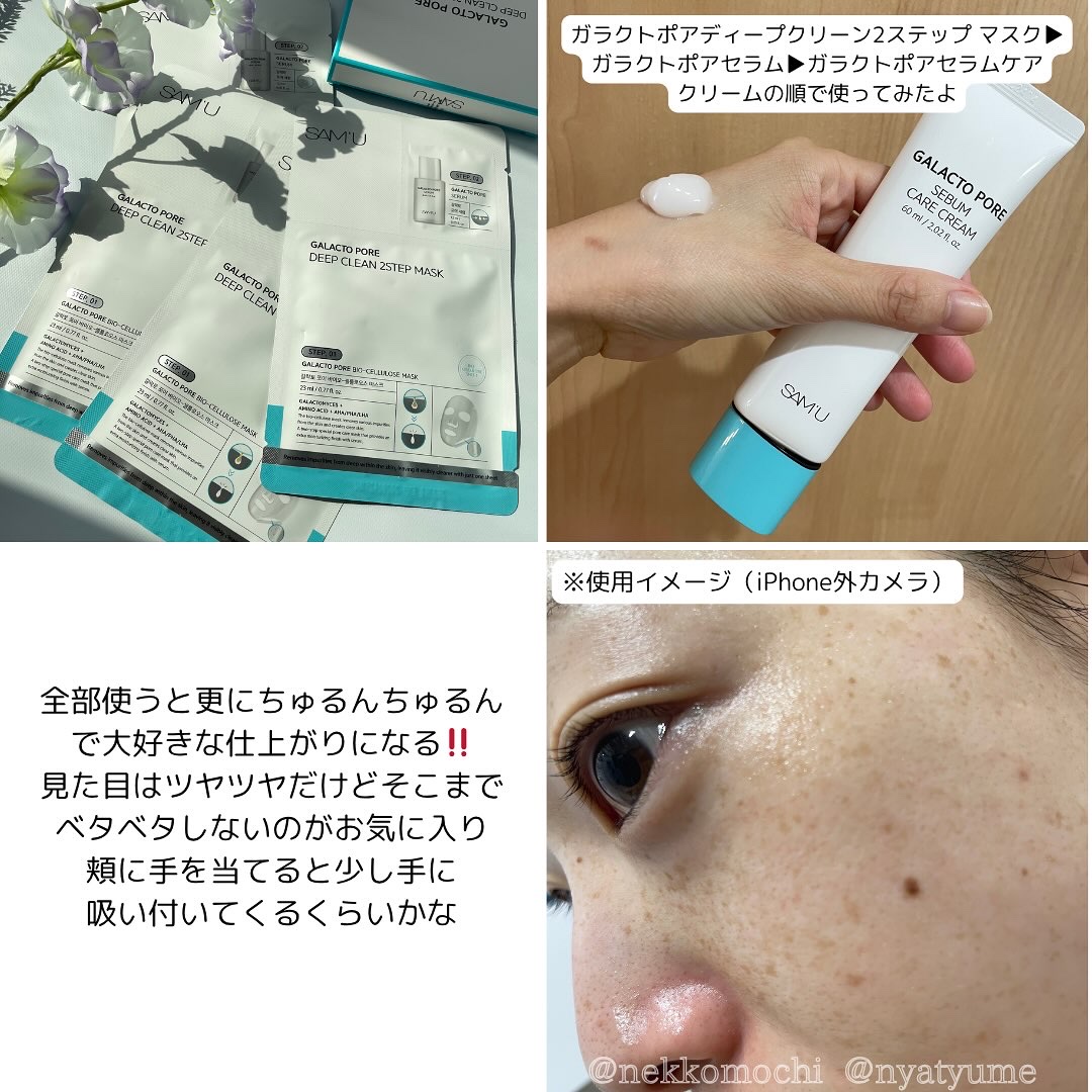 SAM'U(サミュ)スキンケア𓂃🩵ガラクトオーツートナー酸素バブル🫧みずみずしい使用感が心地よい◎🩵ガラクトポアセラムAHA+BHA+PHAの配合。べたつかずにうるおうテクスチャー。🩵ガラクトポアディープクリーン2ステップマスク2ステップ分付...