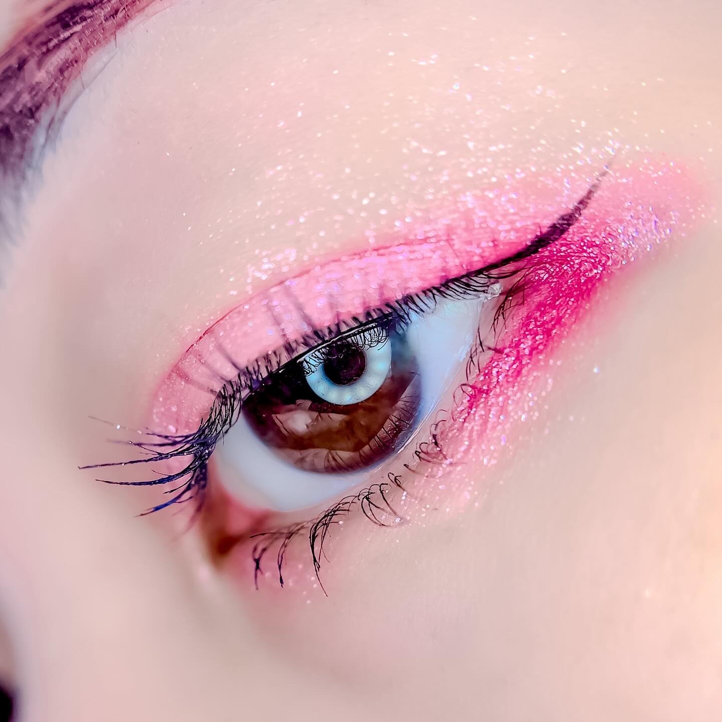 ピンクにグレージュも良いですね👌💗 今日は可愛らしい感じにしてみました💕 上下瞼黒目〜目頭側にラメを塗ってキラキラさせております🤩 目尻はマットのピンクを濃いめに重ねて💗 グレージュのアイライナーと相性◎