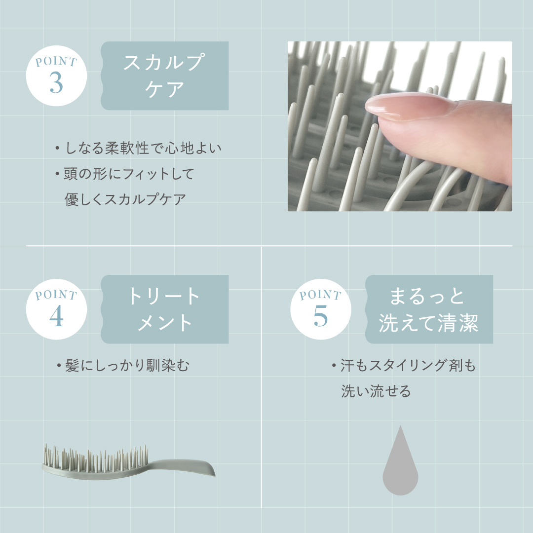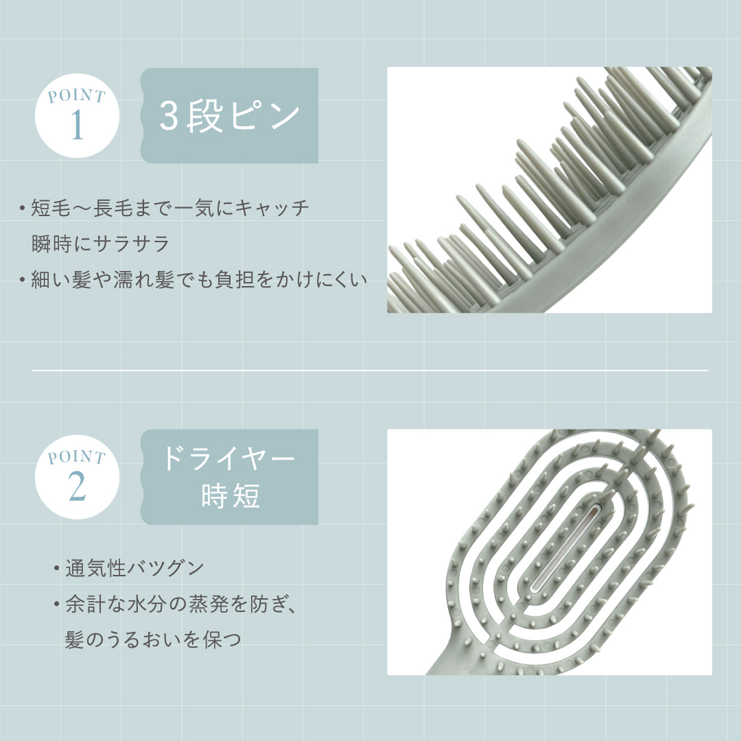 - #バズリブラシのいいとこどり #立つヘアブラシ #まるっと洗えるヘアブラシ ✨コレ1本でヘアケア悩みを解消✨ ①ブラッシング&スタイリング ②ドライ&ブロー ③スカルプケア ④トリートメントコーム 💡おすすめPoint💡 1)特徴的なピン ⇒長さの異なる3本のピンが短い毛~長い毛までしっかりキャッチ ⇒タテ・ヨコ・ナナメ満遍なくとかせて、簡単にやさしくサラサラに ⇒しなやかなピンで、濡髪も細い毛も負担が少なくダメージ減 ⇒円錐形のピンで、トリートメントがピンに付着しづらく、髪に馴染む 2)ブラシ構造 ⇒クモの巣みたいな通気性の良い構造で、速乾だから熱ダメージ減 ⇒水はけも良いので、お風呂でも使いやすい ⇒頭の丸みにあわせてカーブ状だから、頭皮にフィットして気持ちいい ⇒やわらか素材なので、スカルプケアも頭皮にぴったり 3)軽量+コンパクト ⇒「立つヘアブラシ」ケースを付ければ、自立するから、すき間収納OK! ⇒軽量&コンパクトでケース付き、旅行も携帯もラクラク 4)まるっと洗えて清潔 ⇒スタイリング剤・汗でベタベタ髪も大丈夫! ⇒海やプールでも使っても洗える