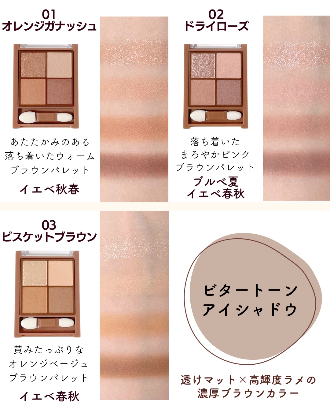 セザンヌの人気シリーズを全色パーソナルカラー分析レビューしました🙌🏻どれも明るめで春夏の方は選び放題!ブルベ冬の私が使うならベージュトーンの05かなあと思います🤔ベージュトーンとビタートーンはラメが華やかなので、濃い色が得意な方でもアイライン...
