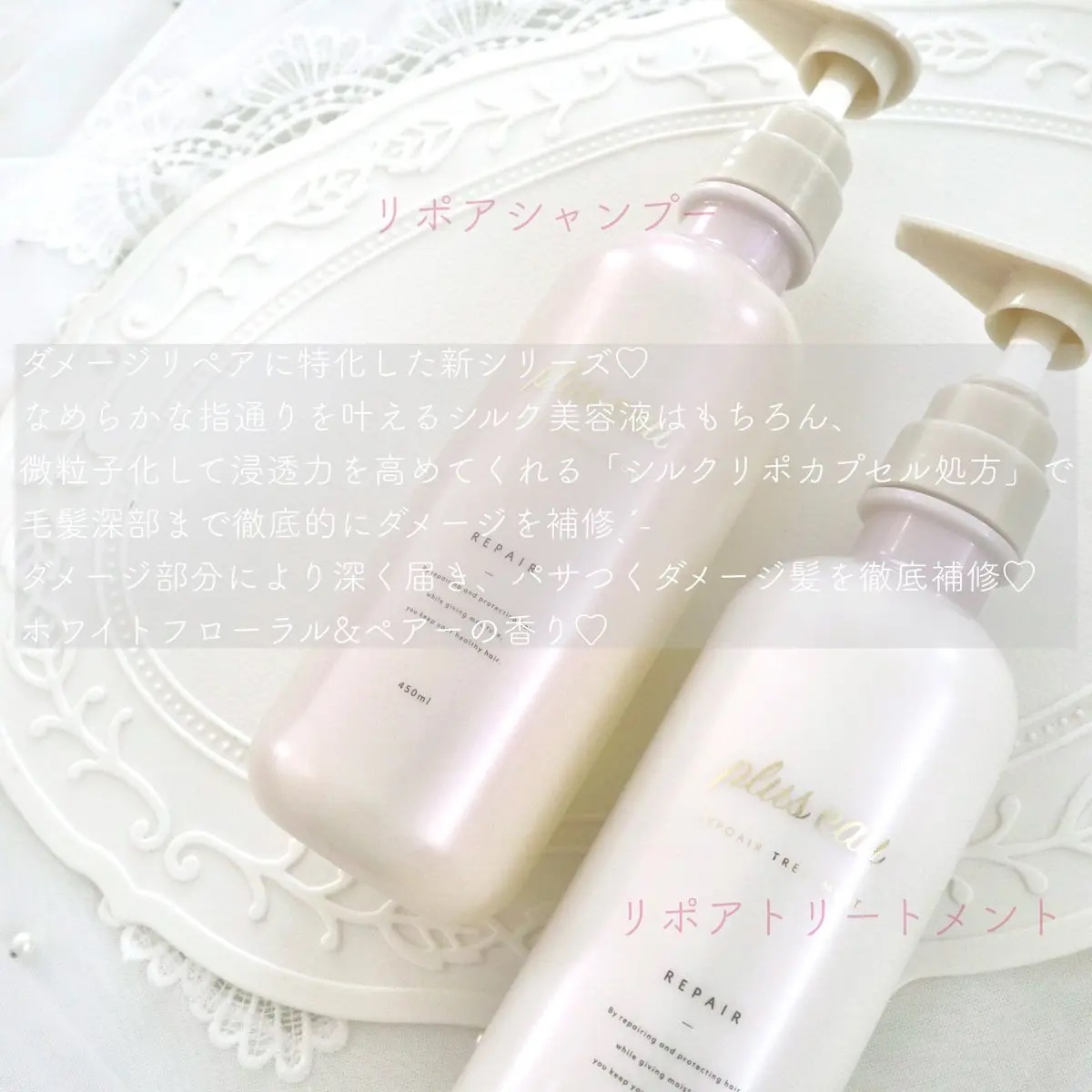 - とろけるような質感と、ダメージでパサつきがちな髪も毛先までツヤめくしっとり髪へ導く美容液シャンプー&光沢補修トリートメント。 より浸透性が高くなるカプセル化技術を採用したシルクリポカプセルを補修成分として配合。 髪の芯まで徹底補修しながらキューティクルをなめらかに整え、しっとりと潤いツヤめく髪へと導きます。 また洗いながらも髪ダメージを補修するPPT系洗浄成分を、シリーズ比で高濃度に配合。 シルク由来PPT系洗浄成分と、肌のことを考えたアミノ酸系の4種の洗浄成分とバランスよくブレンドすることでキメ細かな濃密補修泡が摩擦レスでリッチな洗い心地を実現し、髪と頭皮をいたわりながらシャンプーでも毛髪ダメージに徹底アプローチします。 カシミヤ由来のケラチンをはじめとする2種のケラチン、コラーゲン、CMC類似成分などのこだわり配合した補修成分だけでなく、美容保湿成分をたっぷり浸透させて密封補修することで、カラーや熱ダメージによるパサつき・広がり・ゴワつきなどの蓄積ダメージもしっかりケア。 ドライヤーやヘアアイロンの熱ダメージから髪を守りツヤを与える、ヒートリペア成分を配合して熱も味方に。 清楚な上品さを纏うホワイトフローラル&ペア―の香り。 2024年10月中旬 一部企業にて先行発売