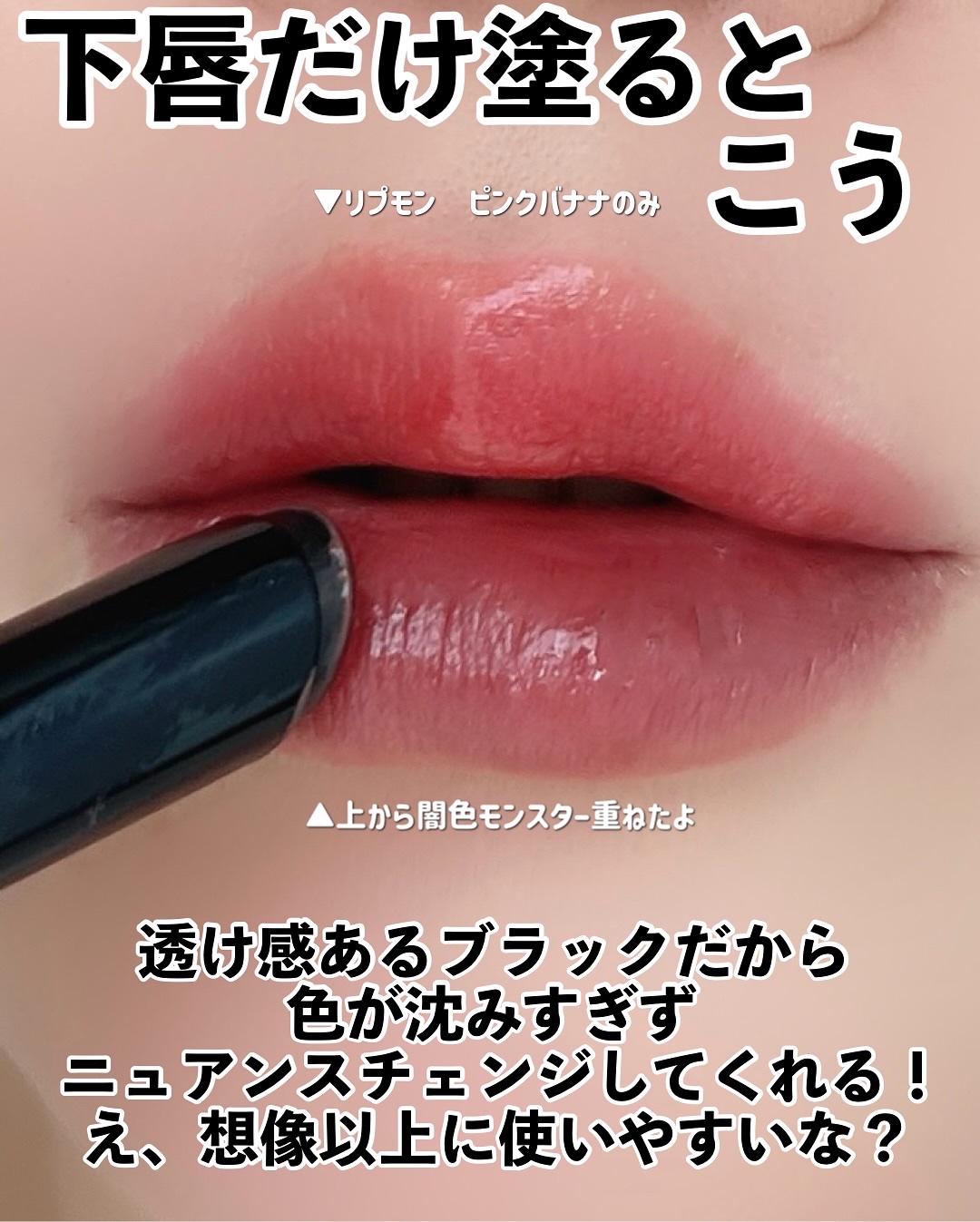 - 【数量限定発売】 口紅の上から重ねて色変化 長時間色持続する闇色モンスター。 当社独自の色持ち技術で、重ねるとモンスター化して落ちにくいリップへ! ■EX-1 苔色モンスター ライトグリーンのリップ上地で、ミルキーなくすみカラーへチェンジ。 ■EX-2 鉄色モンスター ライトグレーのリップ上地で、ダークなスモーキーカラーへチェンジ。 ■EX-3 闇色モンスター クリアブラックのリップ上地で、ダークな深みカラーへチェンジ。