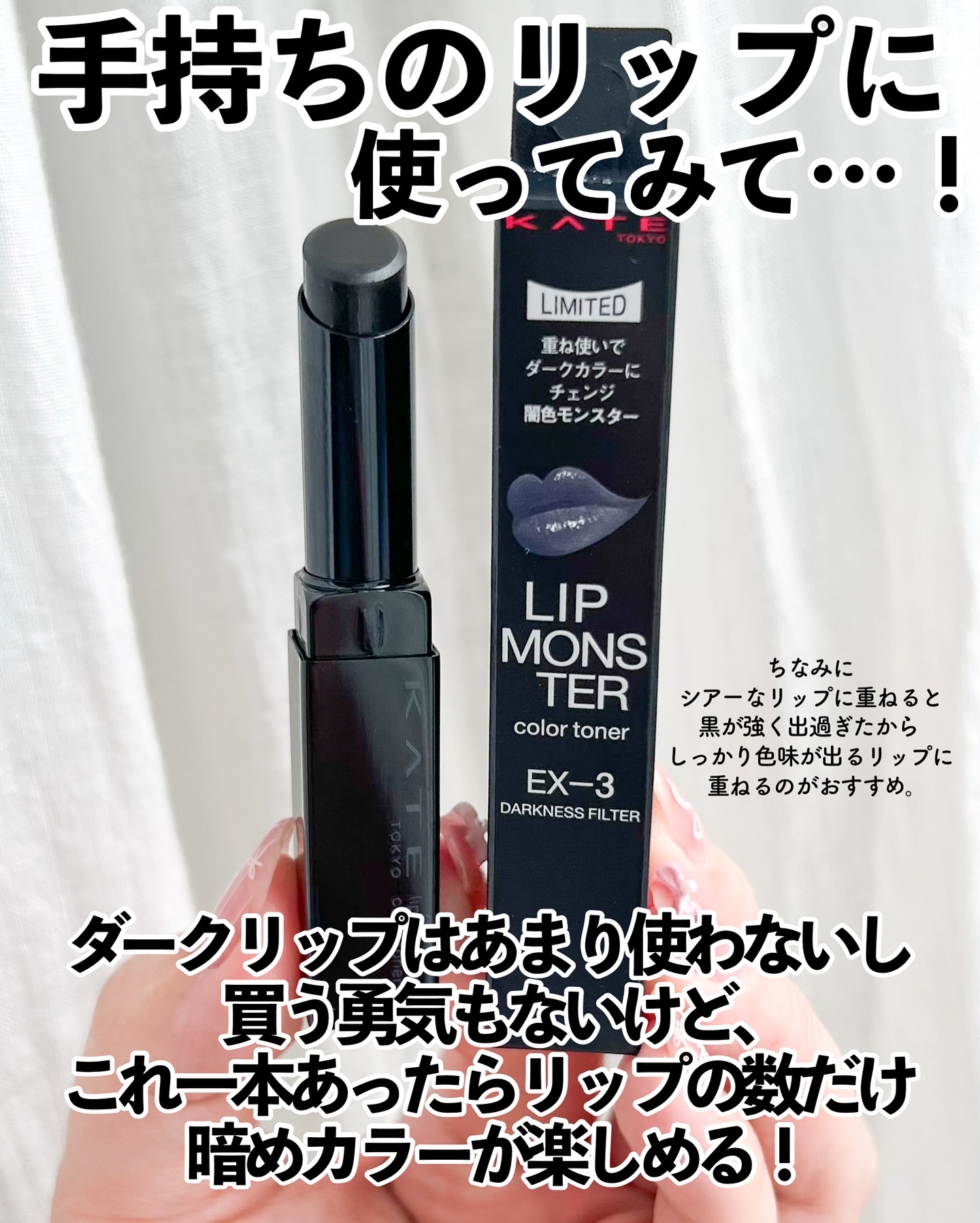 \唇のニュアンス、ディープに!#闇色モンスター/▶︎KATEリップモンスターカラートナーEX-3闇色モンスター7/19に発売されました♡カラートナーは3色目!今回も限定色ですが、今回の闇色モンスターが私的1番好き❤️最近深みのあるリップが好き...