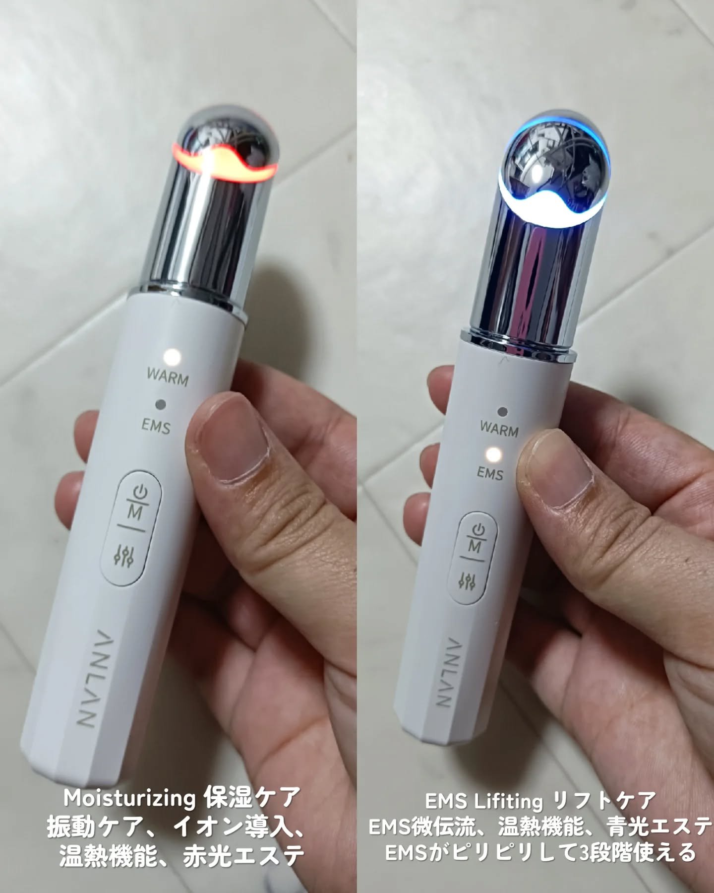 - ANLAN EMS目元美顔器はEMS、温熱、微振動、イオン誘導、2色LED搭載の複合美顔器です。毎日10分で気になる目元·口元をケア!