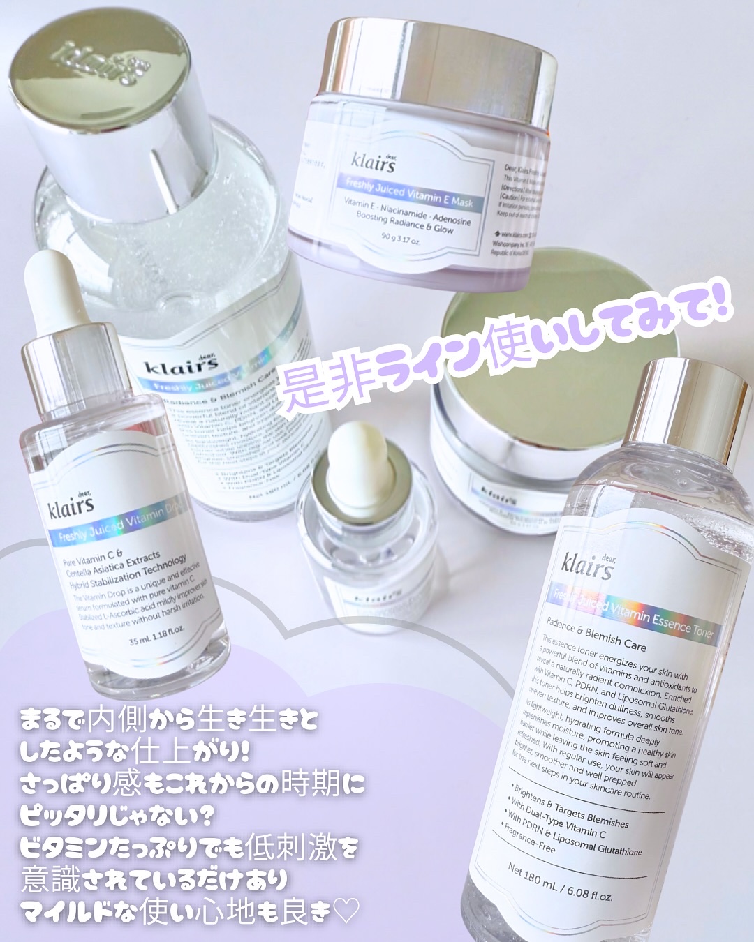 ビタミンシリーズがめっちゃいいじゃん!Klairs@klairs.jpPDRNビタグルカプセル化粧水フレッシュリージュースドビタミンEマスクフレッシュリージュースドビタミンドロップちょいちょい!なんかよさげじゃーん!!このビタミンシリーズ!使...