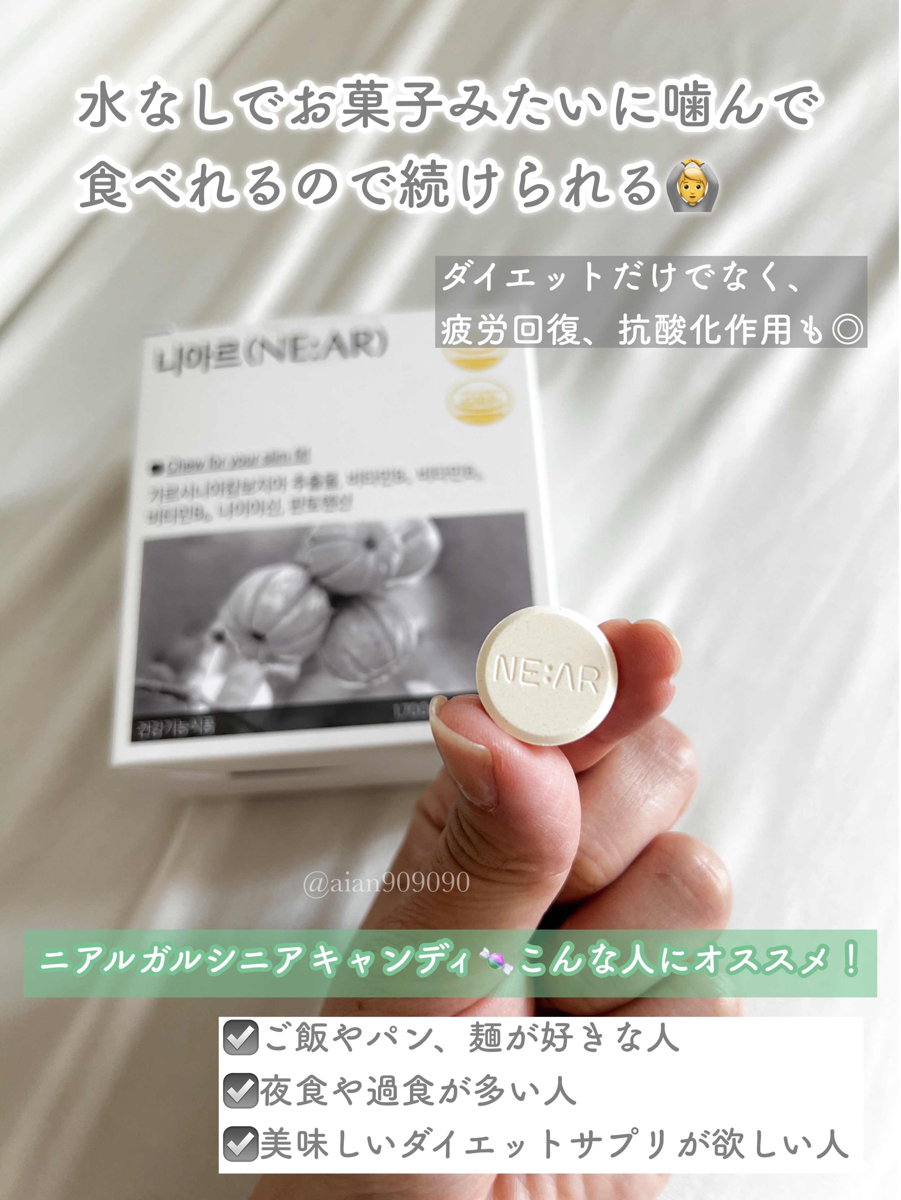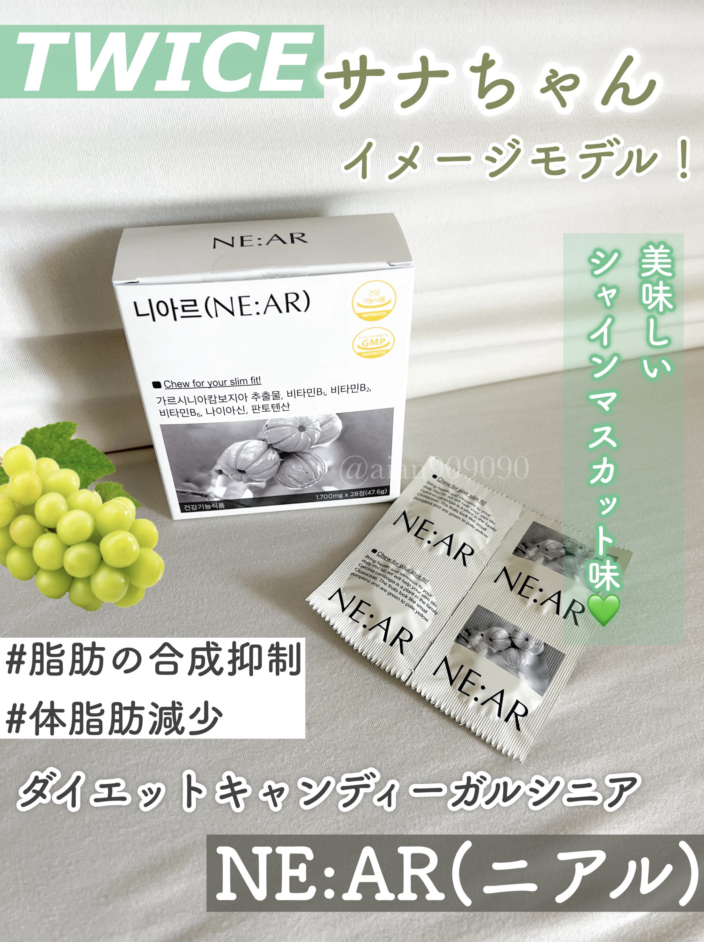 ガルシニアカンボジアエキス 750mgも配合されてるから 摂りすぎた炭水化物が脂肪として合成されるのを抑制してくれるよ◎ お味はみずみずしいシャインマスカット味◎ 1日2粒、食前に舐めるのがオススメ◎ 持ち歩きに最適だしお水もいらないからいつでもどこでも気軽に食べれるのが推しポイント◎