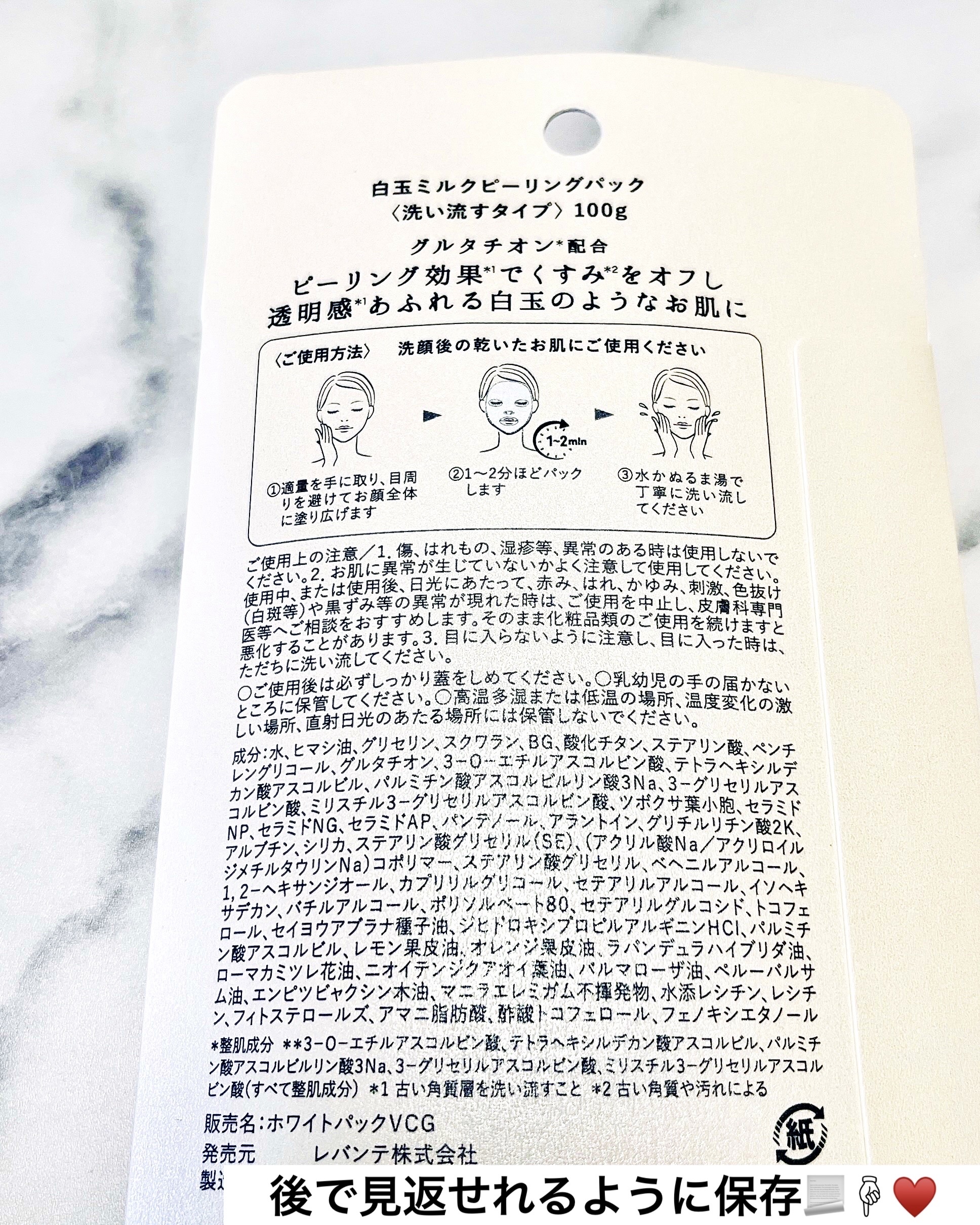 - 塗って、待って、流すだけ。グルタチオン(*1)とビタミンC(*2)を配合したピーリングパック。くすみ(*3)をオフして、透明感あふれる白玉のようなお肌に。 *1 整肌成分 *2 3-O-エチルアスコルビン酸、テトラヘキシルデカン酸アスコルビル、パルミチン酸アスコルビルリン酸3Na、3-グリセリルアスコルビン酸、ミリスチル3-グリセリルアスコルビン酸(すべて整肌成分) *3古い角質や汚れによる