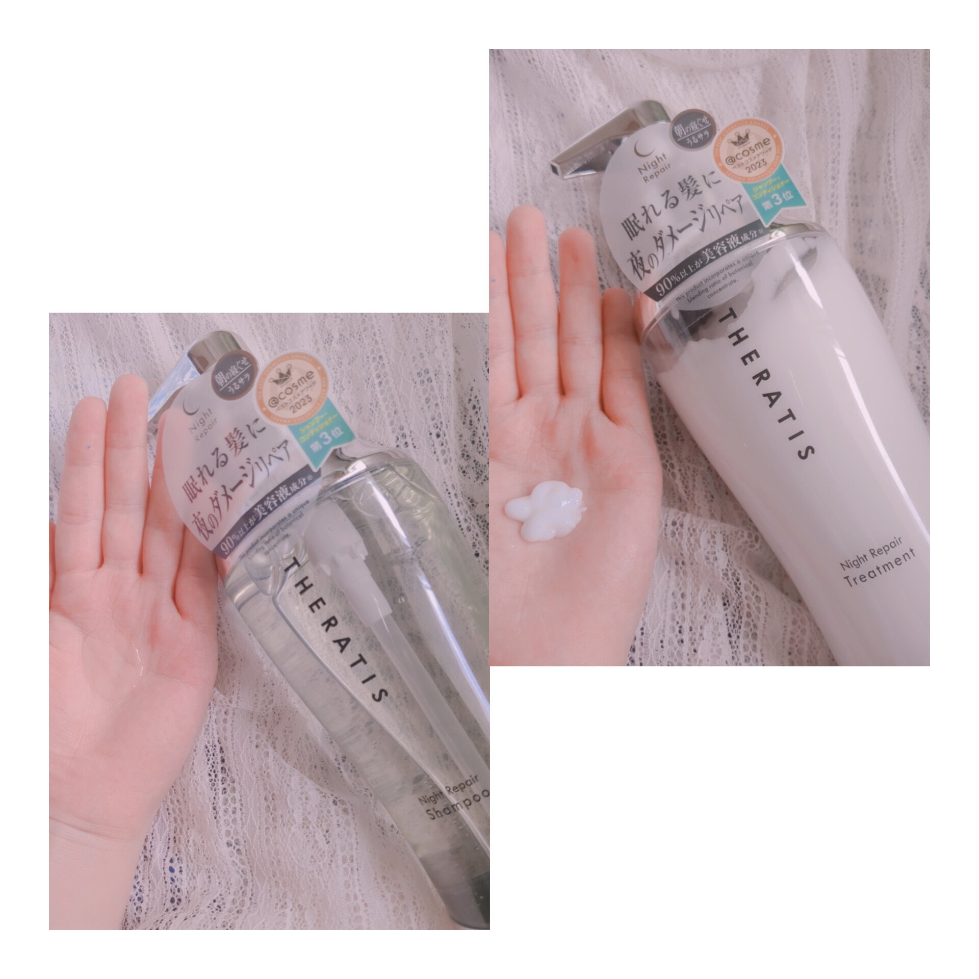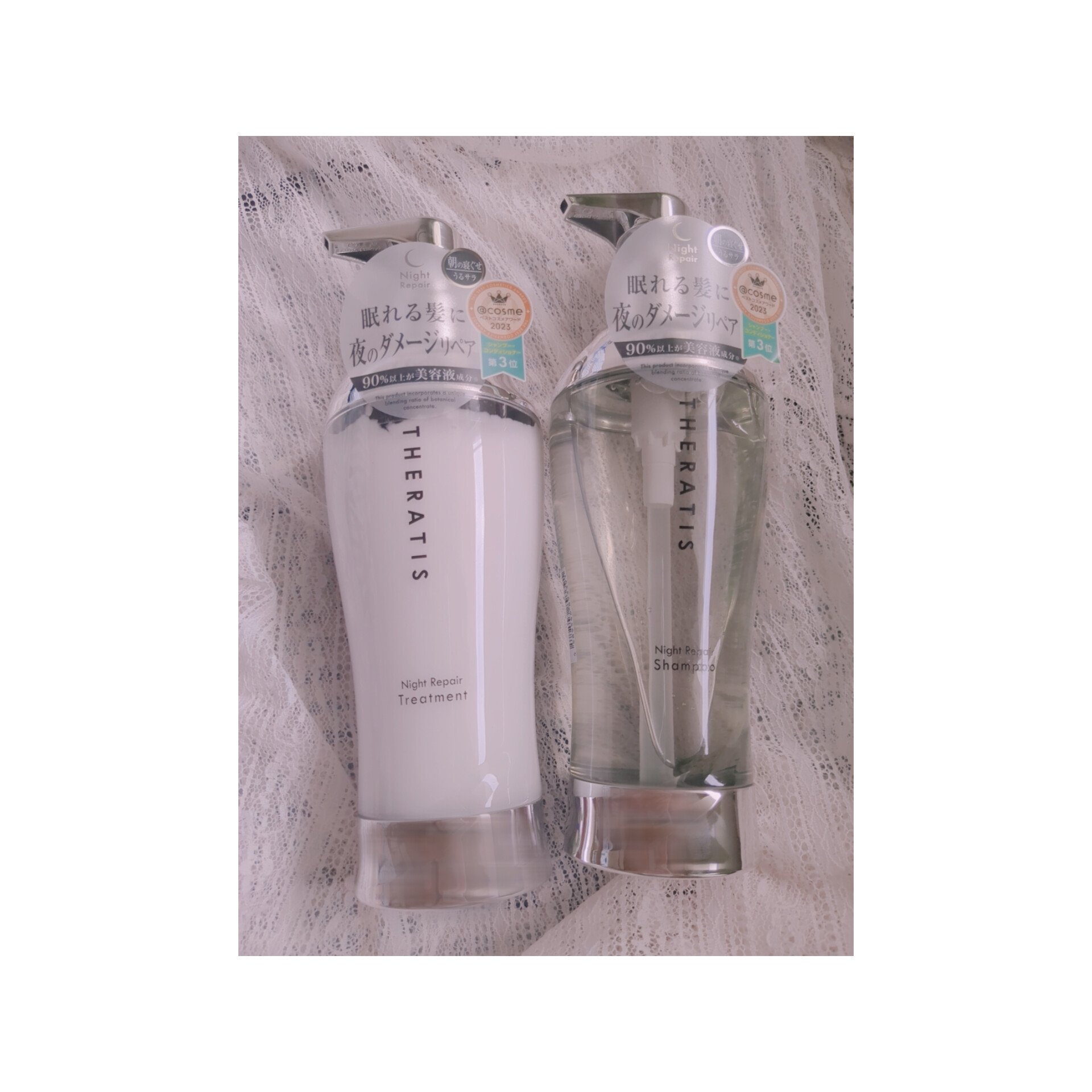 THERATISbymiximナイトリペアシャンプー/ヘアトリートメント*シャンプーはとろみのある感じしっかり泡立ってくれました90%以上が美容液成分で、美髪に導いてくれます😆キシキシせず、シャンプーだけでも、ツルツルな使用感が気に入りました...