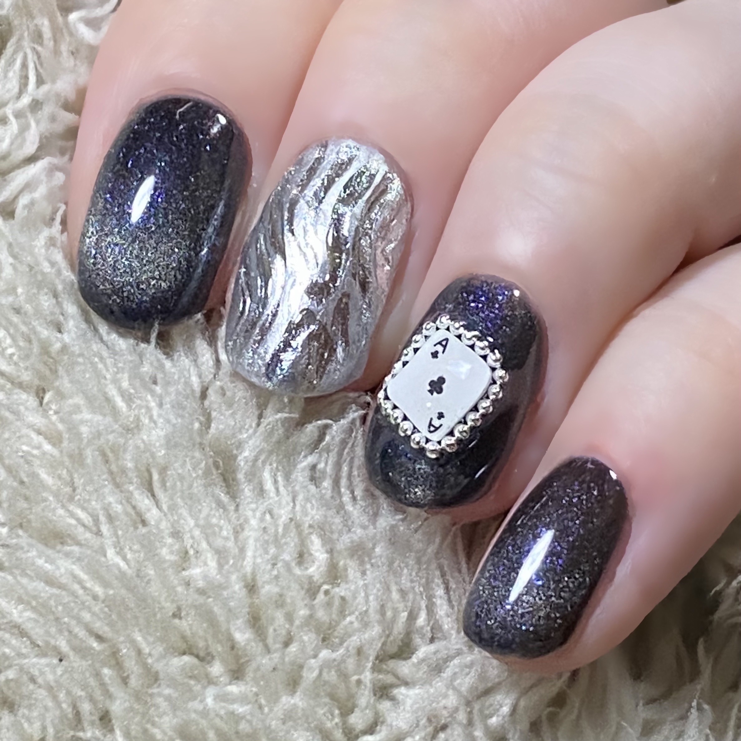ベースカラーは黒っぽいシアーカラーにマグネットでは動かないパープルやブルーのラメが入っています。 シルバーのラメはマグネットでスイスイ動きました。宇宙っぽい配色で可愛いです。 塗布量に差があったのかベースカラーの濃さが異なりますが、どちらも2度塗りです。
