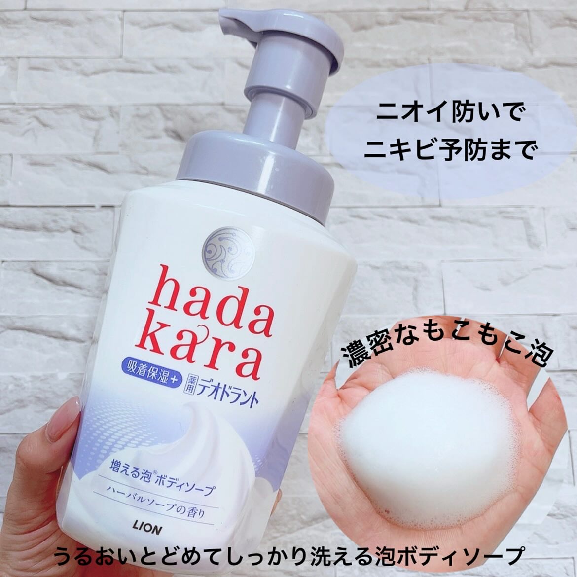 .ライオンさまからいただきました🫧★hadakara 泡で出てくる薬用デオドラントボディソープ【医薬部外品】1プッシュで濃密泡✨ニオイを防いでニキビ予防までしてくれるらしい😉これからの季節に嬉しい☺️ハーバルソープの香りは強すぎず、優しく香る...