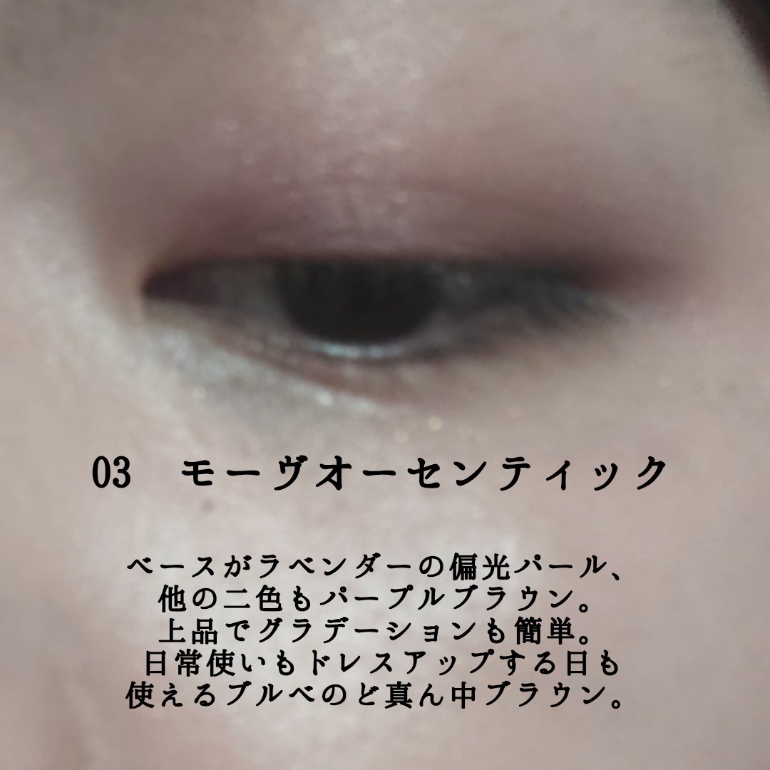 - タッチした瞬間に感じる感覚的な使用感とベーシックなカラー組み合わせのデイリーパレット ファーストタッチで分かる高級感 ベーシックなカラーの組み合わせ いつでもどこにでも持ち運びやすい *当社調べ、個人差があります。 <01 ポータブルベージュ(PORTABLE BEIGE)> メイクの定番&王道クリーミーブラウンカラー <02 ローズクローザー(ROSE CLOSER)> どんなメイクにも使いやすいローズブラウンカラー <03 モーブオーセンティック(MAUVE AUTHENTIC)> 雰囲気を作るモーブブラウンカラー
