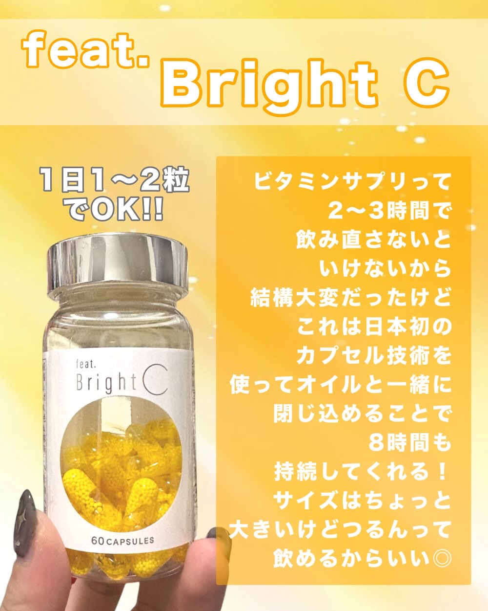 6種の美容ビタミンと4種の美容オイルを配合した、キレイ習慣をサポートする栄養機能食品🌷 ビタミンCを多層化することで、時間をかけてビタミンCを放出🧚🏻♀️ 約8時間体内に留まり続けること🌟 やや大きめのカプセルですが、つるんとしていて飲み込みやすく感じました🌈
