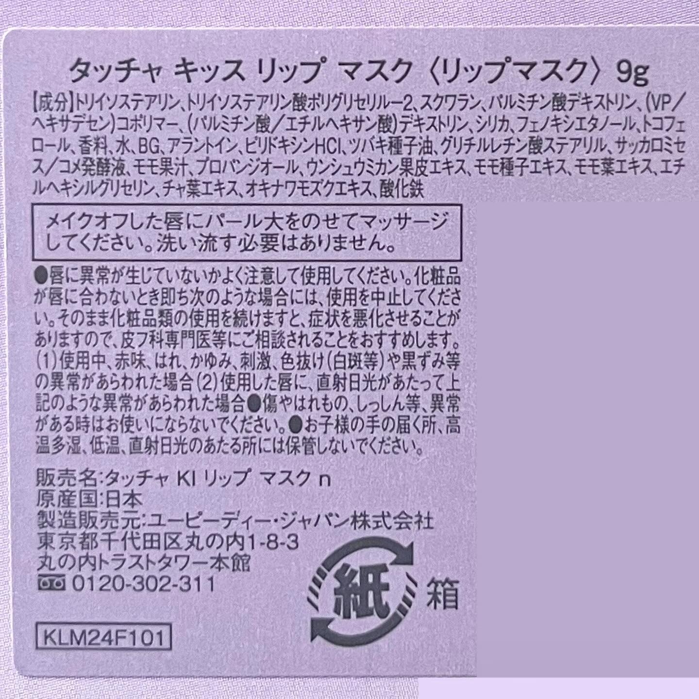 - 濃密なリップマスクでみずみずしい唇に。古来より桃の種を刻み、油と混ぜて唇の乾燥や荒れを防いできた 伝承美容から発想。<HADASEI-3™ : ハダセイ-3™>をベースに、桃の種から抽出されたトウニンエキスや椿油、3種類のローズエキスをブレンドした唇専用マスク。濃密なのにべたつかず、とろけるようなテクスチャー。唇をふっくらなめらかな印象に、また、乾きを感じさせないコンディションへ導きます。 タッチャ独自成分<HADASEI-3™ : ハダセイ-3™>をベースに、桃の種から抽出されたトウニンエキス(※1)や椿油(※2)、3種類のローズエキス(※3)をブレンド。唇をみずみずしく、ふっくらなめらかな印象へと導きます。 ※1. モモ種子エキス(コンディショニング) ※2. ツバキ種子油(保湿) ※3. カニナバラ果実/(センチフォリアバラ/ダマスクバラ)花エキス(コンディショニング) パッケージリニューアル※2024年12月上旬より順次切り替え。