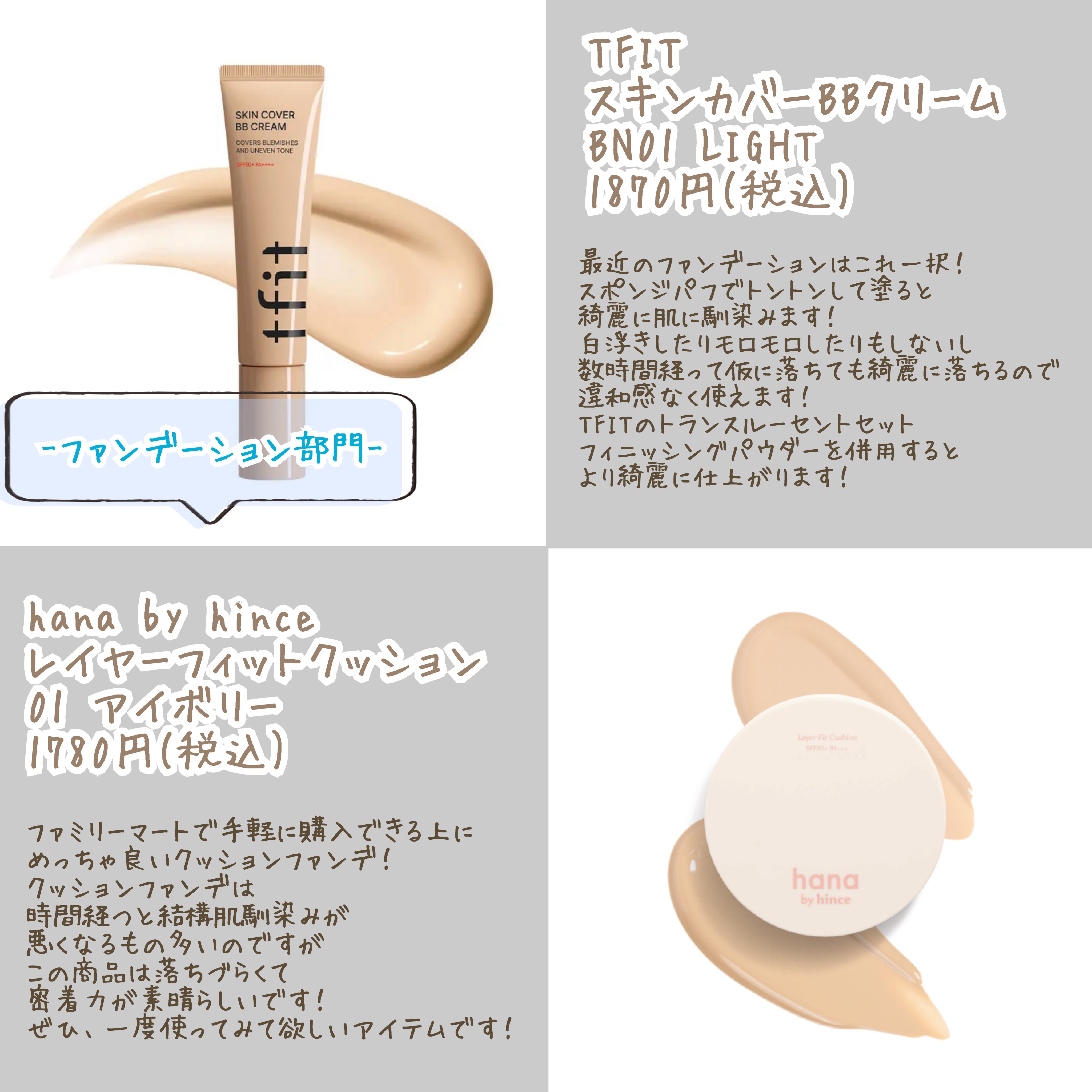 最近使ったファンデーションの中でTFITのBBクリームがかなり優秀でした🥇 保湿力高めで自然なツヤ肌の仕上がりで少量でも伸びる上にコスパ最強です! 水色のハイドレートバニッシュアートプライマーがこんな商品を探していたと思うような優秀な水分クリームで本当に乾燥肌や混合肌な人にはぜひとも使って欲しいアイテムです! パウダーはリピートアイテムです!コンシーラーもかなり使いやすいです!