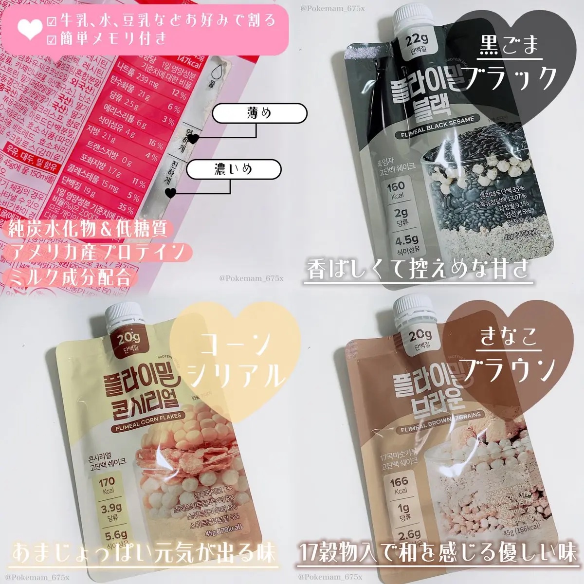 #PRFULLightフライミールプロテインシェイク(9種類)パウチタイプのプロテイン🥛いちごきなこチョコ黒胡椒さつまいもドルチェラテ緑茶コーンシリアルミルクティー水を注いでシェイクするだけですぐに飲める✨サクサクとした噛み応えのプロテインボ...