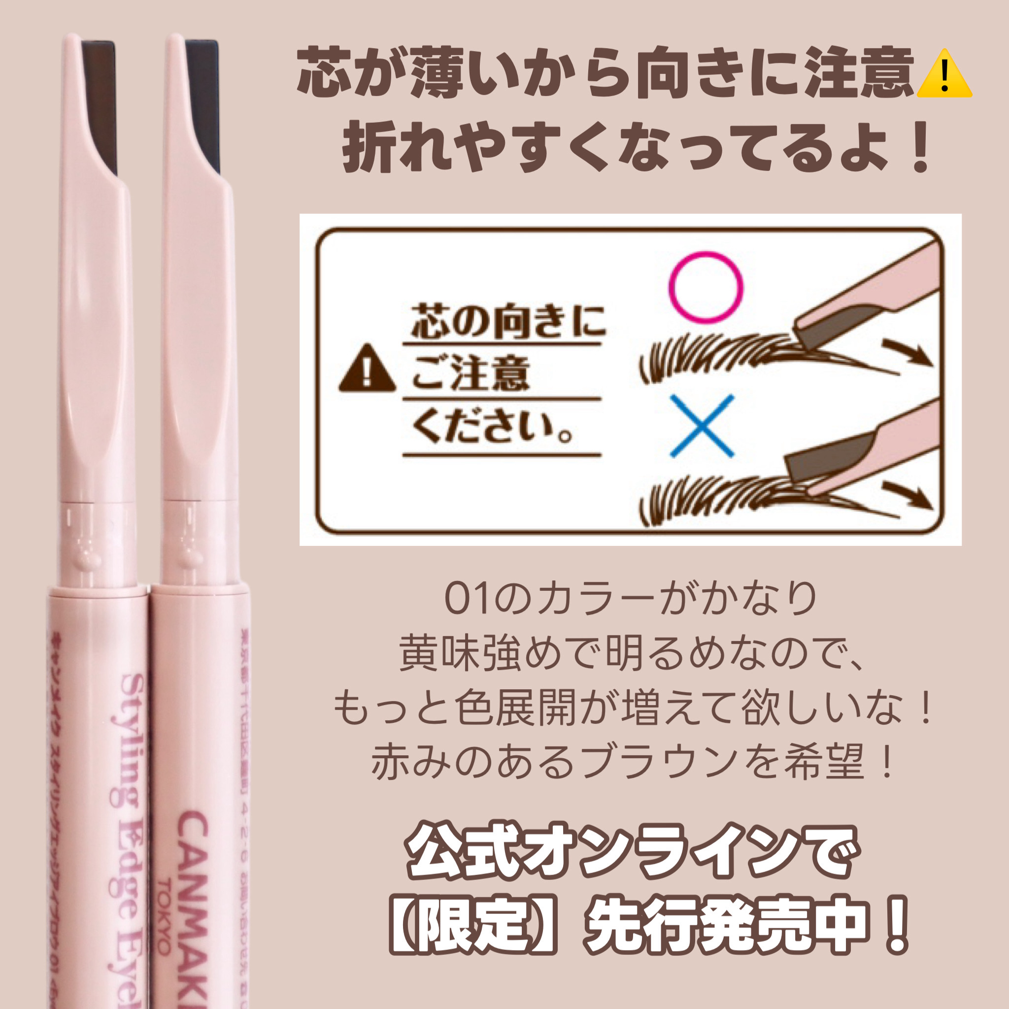 なんと0.8mmの薄型芯!?? キャンメイク スタイリングエッジアイブロウ 01 ナチュラルブラウン ¥770 めちゃくちゃ細くて細かいところも綺麗に描ける! 厚さは極薄だけど芯幅は4.0mmあるので安定して描けるよ! 水・汗・皮脂・こすれに強くて消えやすい眉尻もしっかりキープ♡ 反対側にはスクリューブラシも付いてるよ!