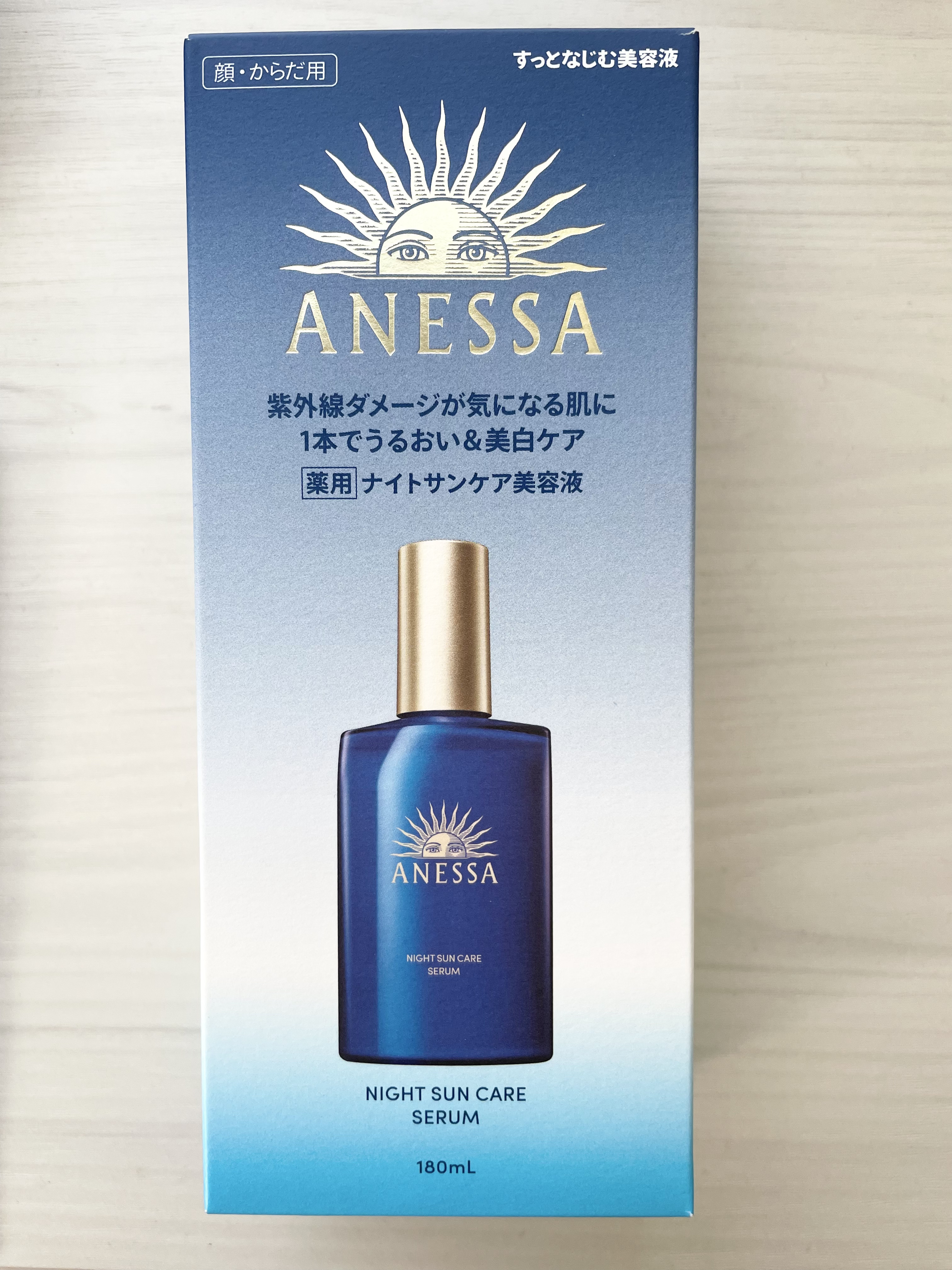 - 【医薬部外品】紫外線ダメージが気になる日の夜に、これ1本でうるおいながら全身の美白※1ケア&シワ改善薬用 ナイトサンケア美容液 ※1 美白とは、メラニンの生成を抑えシミ・そばかすを防ぐこと 紫外線ダメージが気になる肌に就寝中のうるおいケア。美白ケア※1&シワ改善まで。 たっぷりのうるおいで肌の天然バリア膜(角層)を整え、明るく透明感のある肌に導く。 1本で顔・首・腕など全身に使える薬用オールインワン美容液。 ○美白※1&シワ改善有効成分-ナイアシンアミド ○肌あれ防止有効成分-グリチルリチン酸塩 ○うるおいバリア成分-D-グルタミン酸 ○保湿成分:アロエベラエキス、明日葉エキス、緑茶エキス、トルメンチラエキス、グリセリン ○長時間保湿持続効果 ○さらっとした使用感でべたつかない ○すっとなじむ美容液 ○清々しいハーバルグリーン&ラベンダーの心地よい香り ○つめかえ可能なレフィル仕様 ○責任ある木質資源を使用したFSC®認証紙パッケージ ■使用法 ◆洗顔後やお風呂上がりに、お使いください。 ◆顔・首・腕など紫外線の浴びやすい部分を中心に適量を塗り広げてください。 ◆化粧水・乳液・美容液の機能を兼ね備えたオールインワン美容液であるため、これ1本でスキンケアを完了させることができます。お手持ちのスキンケアと合わせてお使いになる場合は、化粧水の後の使用をおすすめします。 ◆「冷やしアネッサ」:冷蔵庫で冷やしてお使いいただくことで清涼感もアップし清々しい使い心地を楽しんでいただくことができます。