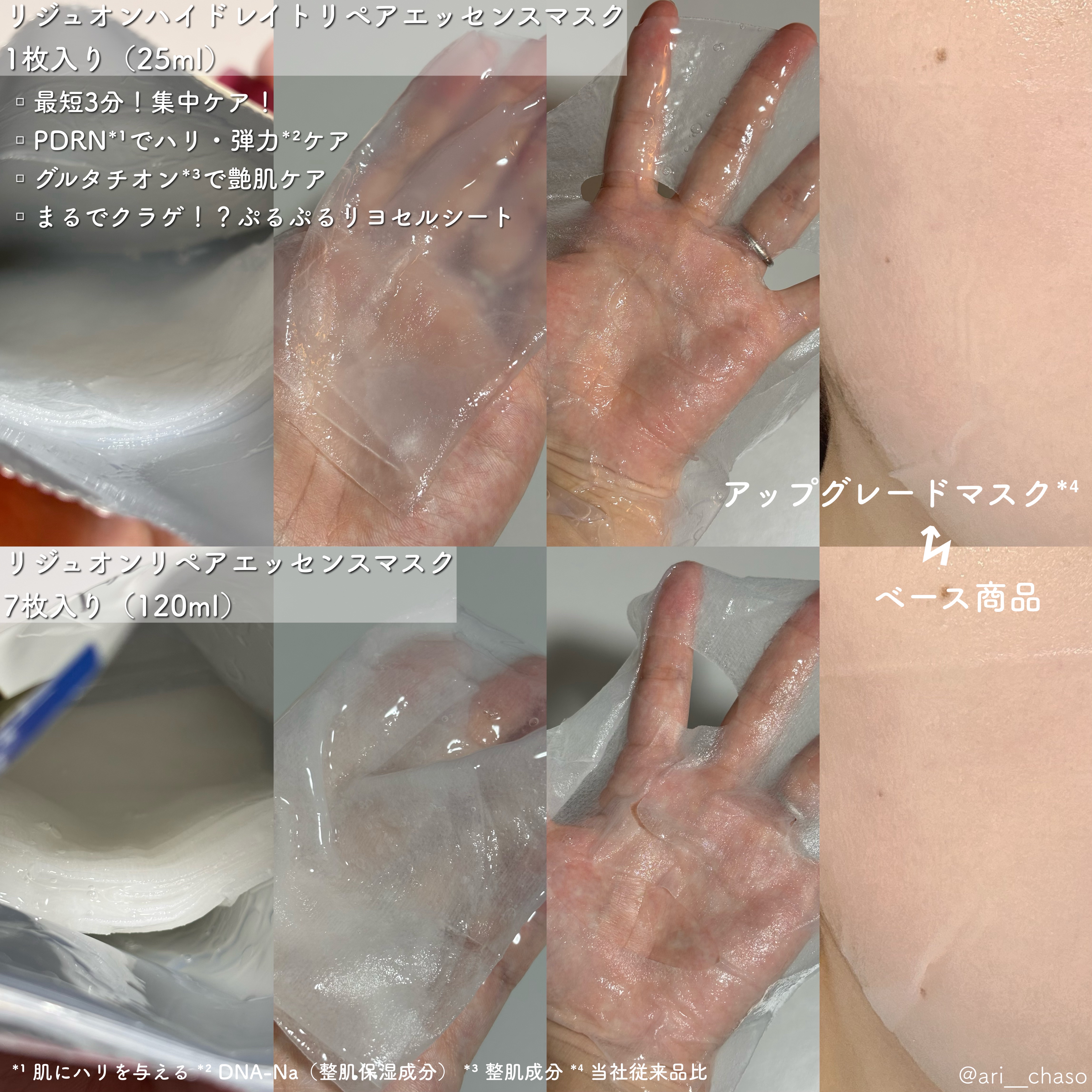 ピュレアさまからいただきました▷リジュオンハイドレイトリペアエッセンスマスク 1枚入り▷リジュオンリペアエッセンスマスク 7枚入りアップグレードマスク「ハイドレイトシリーズ」が誕生✨PDRN*1配合でハリ·弾力*2のある素肌が目指せます。リジ...