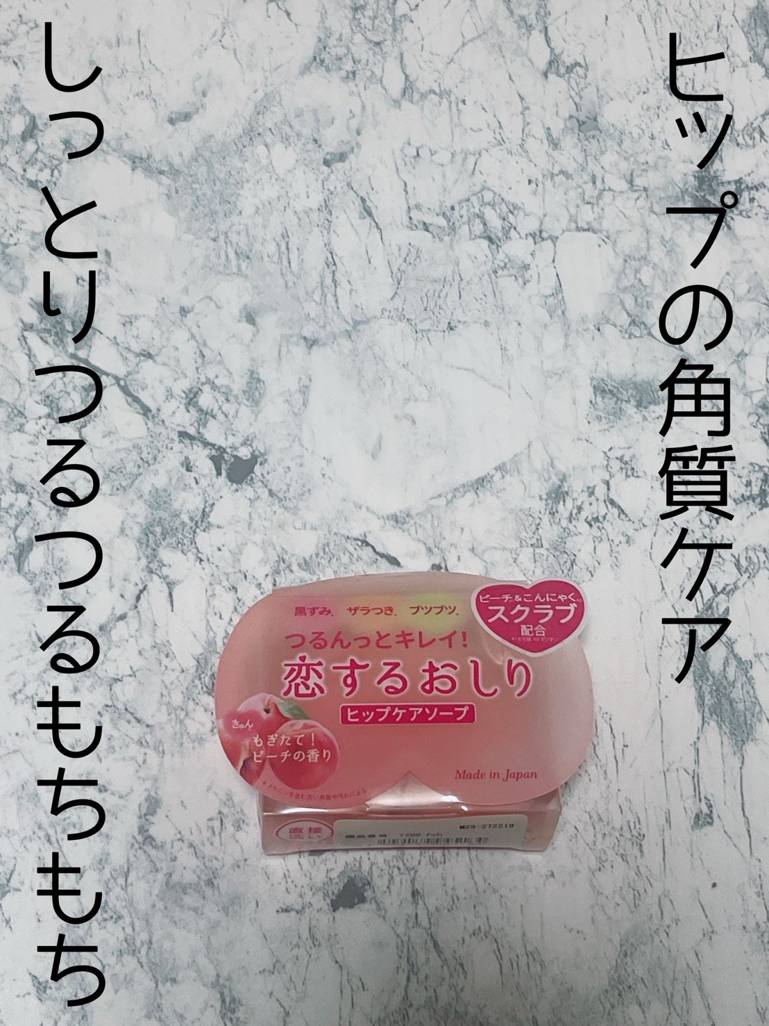 - 恋するおしり ヒップケアソープ おしりの黒ずみ・ザラつき・ブツブツにくるくる直接洗いの簡単ケア! (1)余分な古い角質を落とす:角質ケア スクラブ※1&ピーリング成分※2配合 【モモ核、マンナン※1 グルコノバクター/ハチミツ発酵液、 リンゴ酸・乳酸・クエン酸※2】 (2)必要なうるおいを守る:保湿ケア 6種※3の美容保湿エッセンスを配合 【モモ葉エキス、モモ種子エキス、ビワ葉エキス、キウイエキス、 アーチチョーク葉エキス、アロエベラ液汁※3】 ◎「きゅんっ」とする もぎたて!ピーチの香り