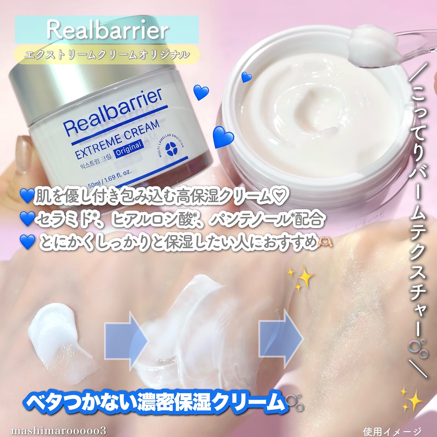肌バリア専門ブランド、リアルバリアは肌のバリア構造と類似した構造を持つ敏感肌のためのスキンケア製品を販売✨️ 肌バリア回復クリームとして有名な「エクストリームクリームオリジナル」はこってりバームテクスチャーでしっとり🩵 「エクストリームエッセンストナーオリジナル」は独自開発オメガセラミド配合。弱くなった肌のバリアを強化💪🏻