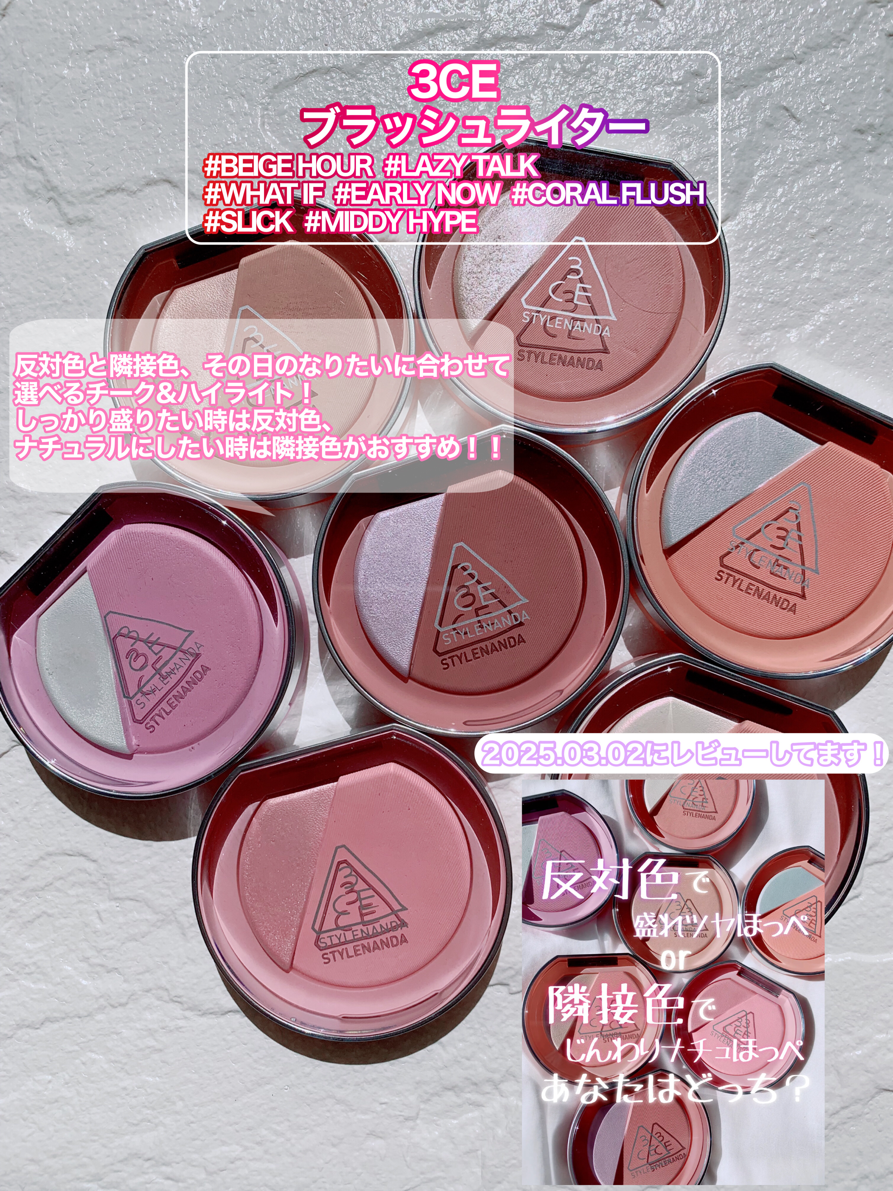 3CEの新作チーク私流超可愛い組み合わせ💜🩷こんにちは!PINOです🐣今回はLIPSベストコスメ2025上半期新作賞、こだわりアワードに選ばれた、3CEブラッシュライターのお気に入りカラー、私が超可愛いと思う組み合わせをご紹介します!※ラメ感...