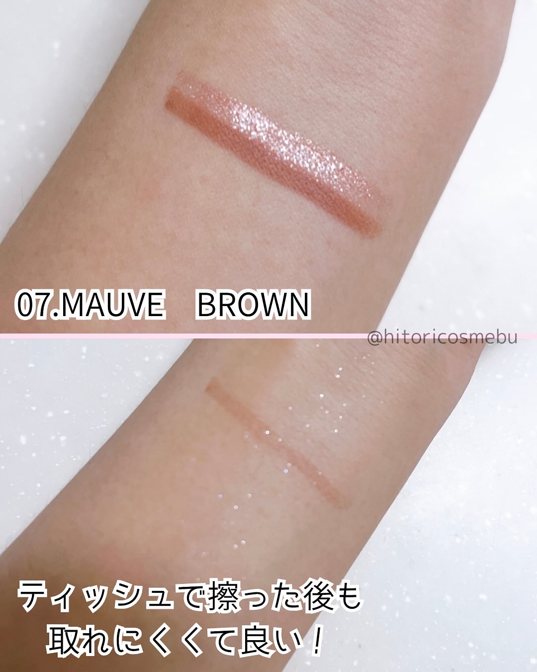- 【01 GOLDEN HAZEL】 シクロペンタシロキサン,トリメチルシロキシケイ酸,ホウケイ酸(Ca/Al),セレシン,ポリエチレン,マイカ,オクチルドデカノール,イソドデカン,酸化チタン,パラフィン,トリイソステアリン酸ポリグリセリル-2,ステアリン酸亜鉛,ジステアルジモニウムヘクトライト,赤酸化鉄,炭酸プロピレン,酸化スズ,カルミン,黒酸化鉄,黄酸化鉄 【02 ROYAL BEIGE】 シクロペンタシロキサン,トリメチルシロキシケイ酸,ホウケイ酸(Ca/チタン),酸化チタン,セレシン,ポリエチレン,マイカ,合成フルオロフロゴパイト,オクチルドデカノール,イソドデカン,パラフィン,トリイソステアリン酸ポリグリセリル-2,シリカ,赤酸化鉄,ステアリン酸亜鉛,ミネラルオイル,ジステアルジモニウムヘクトライト,ジメチコン,炭酸プロピレン,酸化スズ,カルミン,赤202,黄酸化鉄,黒酸化鉄 【03 MAUVE PETAL】 シクロペンタシロキサン,トリメチルシロキシケイ酸,マイカ,ホウケイ酸(Ca/Al),ポリエチレン,セレシン,酸化チタン,合成フルオロフロゴパイト,オクチルドデカノール,赤酸化鉄,イソドデカン,パラフィン,トリイソステアリン酸ポリグリセリル-2,シリカ,ステアリン酸亜鉛,ジステアルジモニウムヘクトライト,炭酸プロピレン,酸化スズ,カルミン,黒酸化鉄,黄酸化鉄,ミネラルオイル,ジメチコン 【04 STARLIT CORAL】 シクロペンタシロキサン,ホウケイ酸(Ca/チタン),トリメチルシロキシケイ酸,ポリエチレン,セレシン,酸化チタン,オクチルドデカノール,イソドデカン,パラフィン,トリイソステアリン酸ポリグリセリル-2,マイカ,ステアリン酸亜鉛,ジステアルジモニウムヘクトライト,赤酸化鉄,炭酸プロピレン,酸化スズ,黄4,合成フルオロフロゴパイト,カルミン,赤202 【05 GLITTER TAP】 シクロペンタシロキサン,トリメチルシロキシケイ酸,シリカ,ポリエチレン,セレシン,ホウケイ酸(Ca/チタン),ホウケイ酸(Ca/Na),オクチルドデカノール,ホウケイ酸(Ca/Al),ミネラルオイル,イソドデカン,パラフィン,マイカ,酸化チタン,トリイソステアリン酸ポリグリセリル-2,赤酸化鉄,ジメチコン,合成フルオロフロゴパイト,ステアリン酸亜鉛,ジステアルジモニウムヘクトライト,炭酸プロピレン,酸化スズ,銀,赤40 【06 RUSSET PINK】 シクロペンタシロキサン,トリメチルシロキシケイ酸,ホウケイ酸(Ca/Al),ポリエチレン,セレシン,ホウケイ酸(Ca/チタン),シリカ,オクチルドデカノール,合成フルオロフロゴパイト,イソドデカン,パラフィン,ミネラルオイル,酸化チタン,トリイソステアリン酸ポリグリセリル-2,ジメチコン,ステアリン酸亜鉛,黄5,銀,ジステアルジモニウムヘクトライト,黄4,炭酸プロピレン,酸化スズ,赤202,カルミン,ポリヒドロキシステアリン酸,パルミチン酸エチルヘキシル,ミリスチン酸イソプロピル,イソステアリン酸,レシチン,ポリリシノレイン酸ポリグリセリル-3 【07 MAUVE BROWN】 シクロペンタシロキサン,トリメチルシロキシケイ酸,ホウケイ酸(Ca/チタン),セレシン,ポリエチレン,マイカ,酸化チタン,オクチルドデカノール,シリカ,イソドデカン,パラフィン,トリイソステアリン酸ポリグリセリル-2,赤酸化鉄,ミネラルオイル,ホウケイ酸(Ca/Al),ステアリン酸亜鉛,ジステアルジモニウムヘクトライト,ジメチコン,カルミン,炭酸プロピレン,銀,酸化スズ,黄酸化鉄,黒酸化鉄,ポリヒドロキシステアリン酸,パルミチン酸エチルヘキシル,ミリスチン酸イソプロピル,イソステアリン酸,レシチン,ポリリシノレイン酸ポリグリセリル-3 【08 RUSTIC BROWN】 シクロペンタシロキサン,トリメチルシロキシケイ酸,合成フルオロフロゴパイト,シリカ,ポリエチレン,セレシン,オクチルドデカノール,ホウケイ酸(Ca/Al),イソドデカン,マイカ,パラフィン,酸化チタン,ミネラルオイル,トリイソステアリン酸ポリグリセリル-2,赤酸化鉄,ジメチコン,ステアリン酸亜鉛,ジステアルジモニウムヘクトライト,酸化スズ,炭酸プロピレン,黒酸化鉄