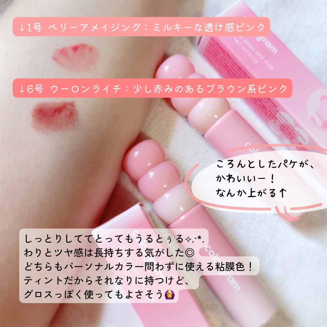 フルーツ飴ミルキーティント🍓🥛💕白みがあってミュートメイクにもぴったり🤍今っぽさが出るから好き🐰!ぷるちゅるで唇のスキンケアをしたような保湿感もあるのもよき💗Colorgramタンフルグラスティントミルク01ベリーアメイジング:まろやかピュ...