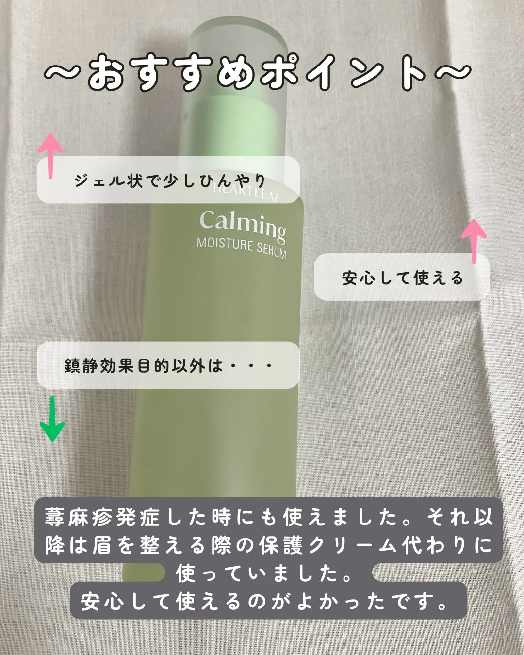 みずみずしいテクスチャーでさっぱり🫧 なので主に朝のスキンケアに使ってた☀️ 保湿力は高くはないけどまあまあ◎ 鎮静効果はあったのかわからない💭 癖がなくて使いやすいのはよかった🌱