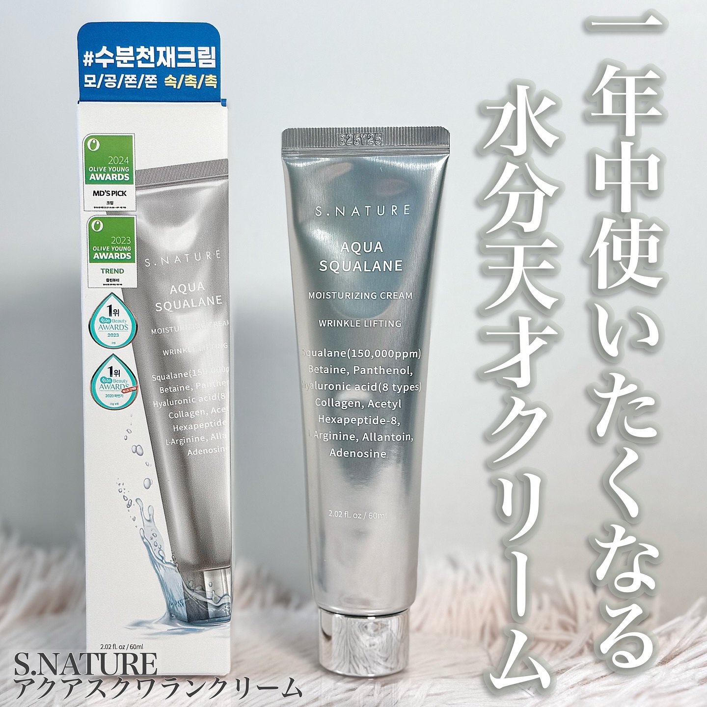 \水分天才クリーム/オリーブヤングでも大人気のS.NATUREのアクアスクワランクリーム全ての肌タイプに使えてベタつかない軽い使用感が特徴的🩶ビタミンB5パンテノールや8種類のヒアルロン酸が入ってるよ!植物由来のスクワランも入ってるから皮脂コ...
