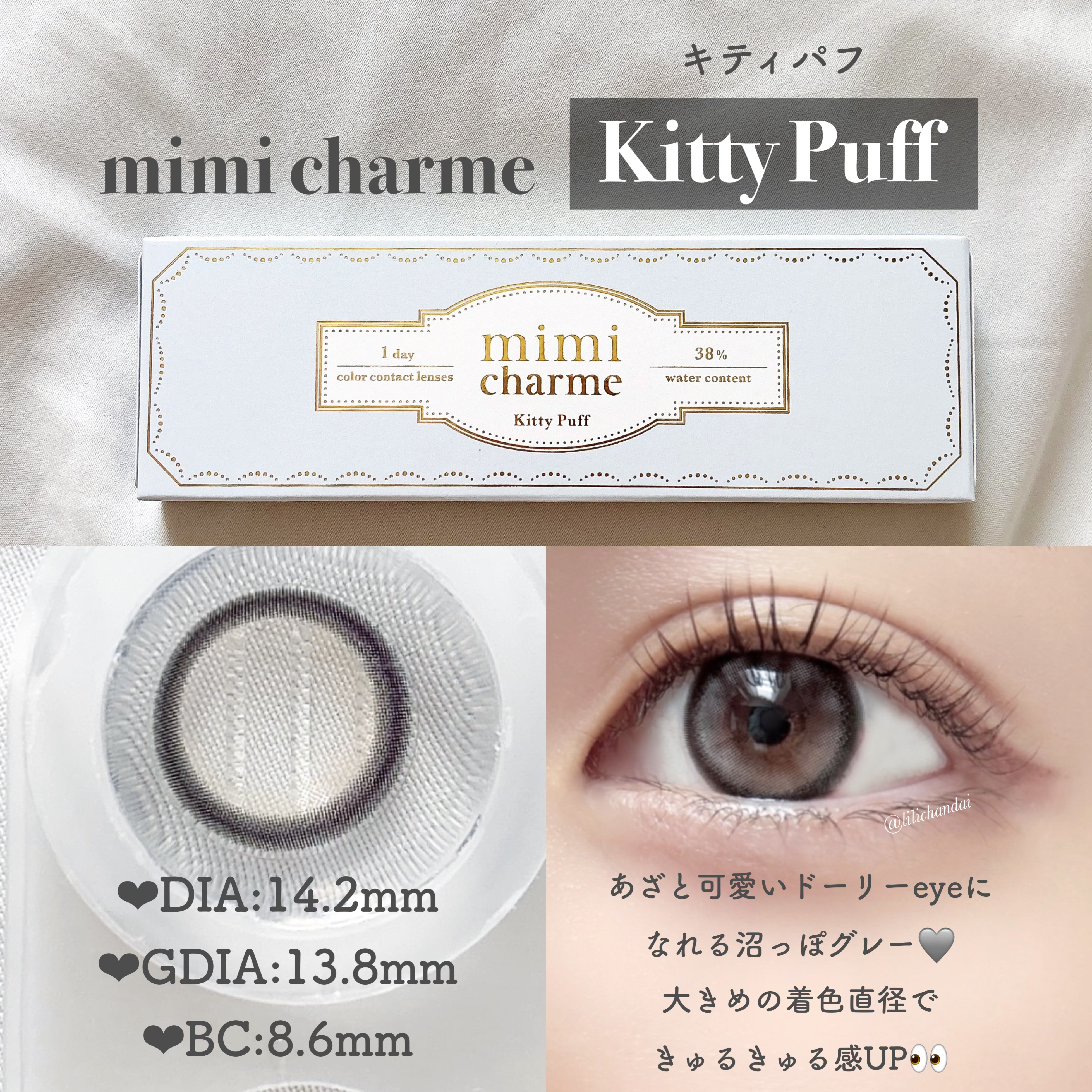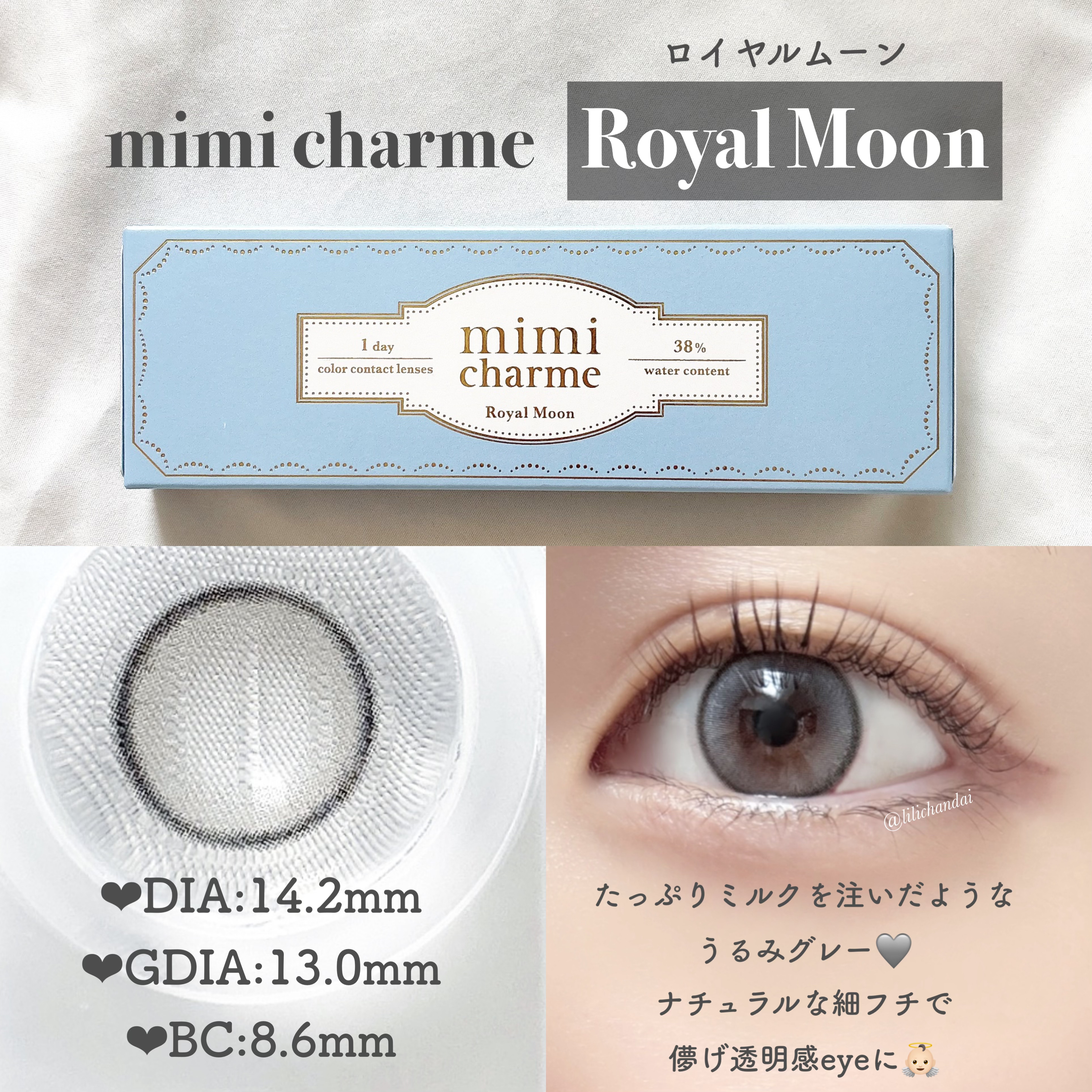 - 誰もが物語の主人公。 舞台の上でスポットライトを浴びているように瞳に魅力と光をまとわせ、毎日のわたしをより一層美しく輝かせる。 mimi charme(ミミシャルム)と一緒に物語の続きを。 <キティパフ> DIA14.2mm/着色直径13.8mm 太フチ無敵盛れ水光グレー あざと子猫ちゃんになれちゃう! 一軍太フチグレーレンズ <ジェムグレージュ> DIA14.2mm/着色直径13.5mm 細フチ大人っぽ水光グレージュ グレーなのにナチュラルでデイリー使いしやすい! <ドーリードロップ> DIA14.2mm/着色直径13.6mm 新感覚♡きゅるん盛れドーリーアイ 散りばめたブルーのハイライトがトレンド感満載! <ハニーシロップ> DIA14.2mm/着色直径13.5mm 細フチあざと水光ブラウン 新王道!垢抜け水光ブラウンレンズ <ムーンラテ> DIA14.2mm/着色直径13.0mm キラめき水光ミルキーベージュ オシャレな放射状ハイライトでまるで発光しているような瞳へ! <ロイヤルムーン> DIA14.2mm/着色直径13.0mm キラめき水光ミルキーグレー あの大人気カラームーンラテの色違い! 儚げうるみグレーレンズ カラーコンタクトレンズの不適正使用による眼障害の危険性等などがあります。 ●コンタクトレンズは高度管理医療機器です。不十分な洗浄・消毒など不適切なケアや、長時間・交換期間を超えた装用により、アレルギー性結膜炎、角膜感染症、角膜潰瘍等の重篤な眼障害が発生する危険性があります ●ご使用前に取扱説明書を確認してください 使用上の留意事項 ●眼科医院等を受診してからお求めください ●眼に異常を感じたら直ちにレンズ使用を中止し、お近くの眼科等で診察を受けてください ●医師の指示にしたがってご使用ください ●コンタクトレンズを装用する場合、自覚症状がなくても、眼科医院等での定期検査を受けてください ●レンズに不具合がある場合は使用しないでください