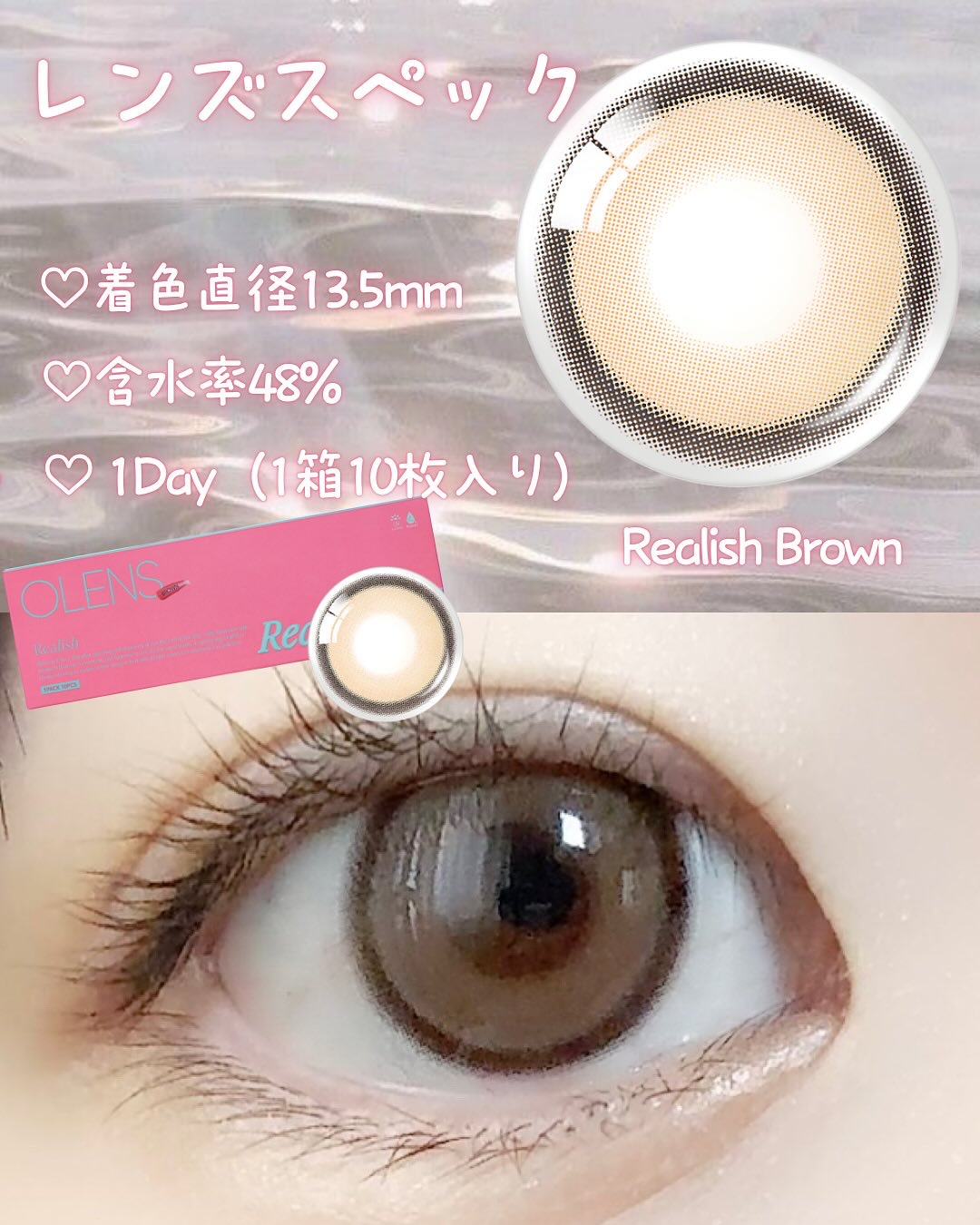 - 韓国カラコン業界の話題のブランド『OLENS(オーレンズ)』の日本正式承認商品シリーズ。 世界中から注目を浴びるグループ「NewJeans (ニュージーンズ)」がイメージモデル。 そんなOLENSの人気定番シリーズ『リアルリング』のDIAを大きくした『リアリッシュ』が日本初登場!オーレンズ初のDIA14.5mmで「大きいのにナチュラル」「瞳を自然に明るく見せてくれる」と話題の新シリーズ。トーンアップカラーとうるうる感が透明感をプラスしてくれます。 ■OLENS Realish(オーレンズリアリッシュ) ・枚数:1箱10枚入り ・カラー :全2色 ■使い方 コンタクトレンズは高度管理医療機器です。必ず眼科医の処方に従って購入してください。 ■使用上の留意事項 コンタクトレンズは高度管理医療機器です。眼科医の指導に従い装用期間を厳守し、正しくお使いください。眼の定期検査を必ず受けてください。添付文書を必ず読み、取扱方法、装用時間を守って正しくお使いください。少しでも異常を感じたら、直ちに眼科医の検査を受けてください。