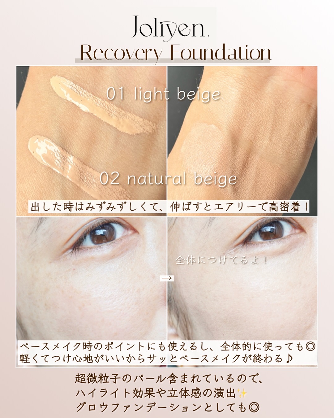- メイクの上から簡単お直し 立体感の演出やリフトアップ効果も! 「リカバリーファンデーション」はファンデの崩れやヨレ、毛穴落ちが気になる部分に指でのせるだけ。超微粒子のパールが光を拡散し肌の凹凸をカバー。滑らかで伸びの良いテクスチャーが肌に自然と馴染み、高密着なのに厚塗り感はゼロ。ナイアシンアミドやツボクサエキス、カレンデュラなど15種以上の美容成分を配合することで、肌に負担をかけることなく内側から潤いに満ちたツヤ肌へと導きます。 カラーは全2種。ニュートラルなベージュカラーを実現したことで、パーソナルカラーにとらわれず使い方に応じて2色からお選びいただけます。 01ライトベージュはくすみが気になる時におすすめ。ハイライト効果もあり、鼻筋やあご先などに使うと立体感を演出できます。 02ナチュラルベージュは目の下から頬、おでこや眉下などの広範囲に。赤みが気になる部分をカバーします。 「リカバリーファンデーション」は2025年4月2日よりJoliyen.公式オンラインでの販売をスタートしたのを皮切りに、4月15日〜伊勢丹新宿店本館1階「Yep’s by SEEDS MARKET]、グラングリーン大阪南館2階「Kulture Market」、4月20日〜楽天市場公式、4月25日〜全国ロフト、アインズ&トルペにて販売