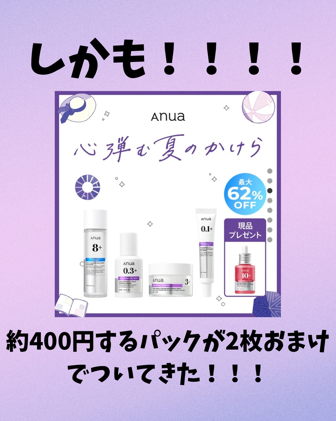 Qoo10で個人的におすすめする化粧品の紹介です!①②アヌア「心弾む夏のかけら」セットプレゼントとして現品のダークスポットセラムがついてくる!個人的にはレチノールのセットか、アデライン酸のセットがおすすめ!通常だったら15,700円のところが...