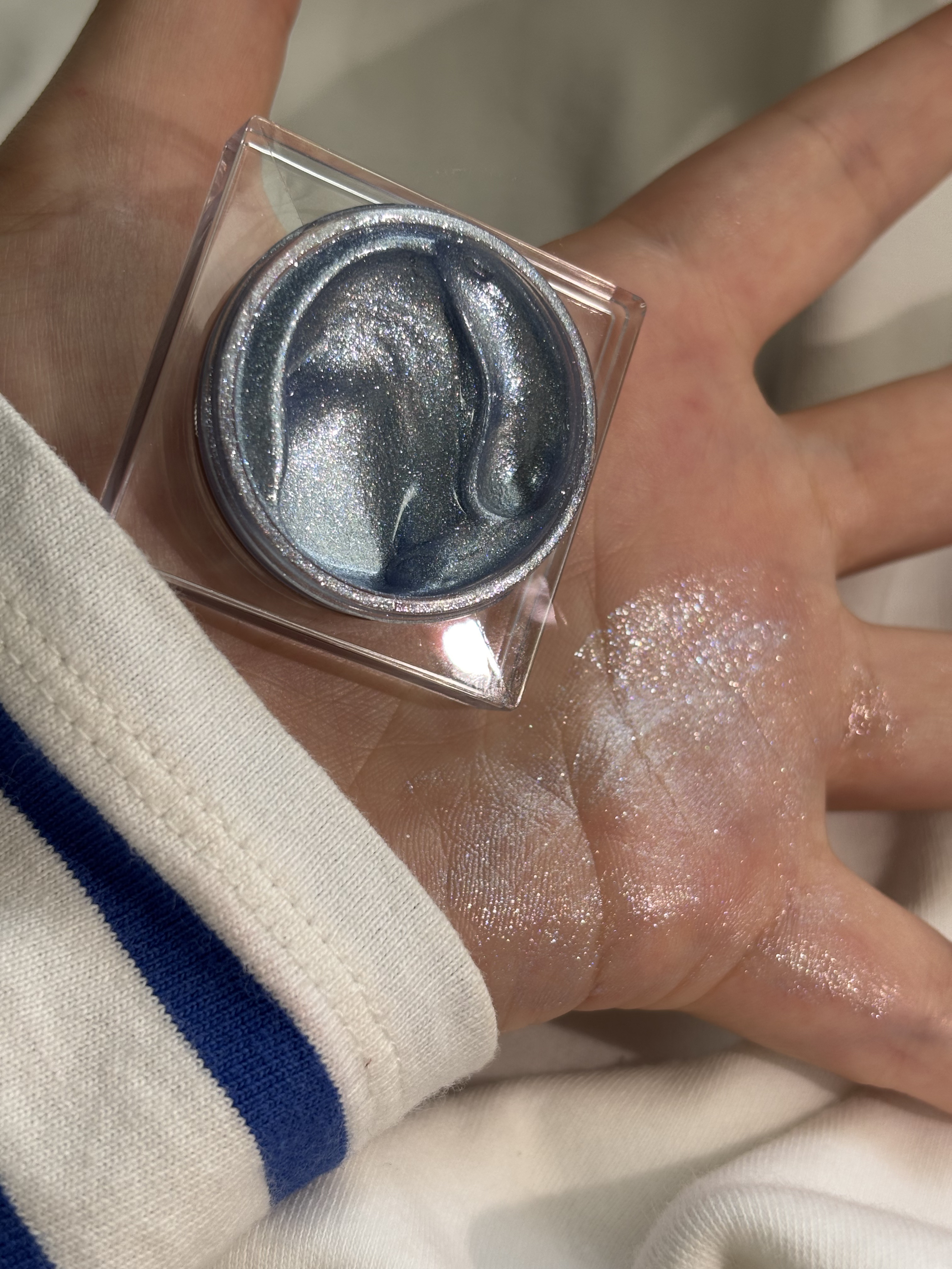 ツヤッツヤのハイライト。 めっちゃ綺麗過ぎる…!!! 清涼感のあるマリンブルーは塗るとそこまで色は付かず透明感のあるブルーで ラメが細かいので自然にツヤが出ます。 なのでデイリーにも可愛いしイベントメイクでキラッキラにするのも◎!