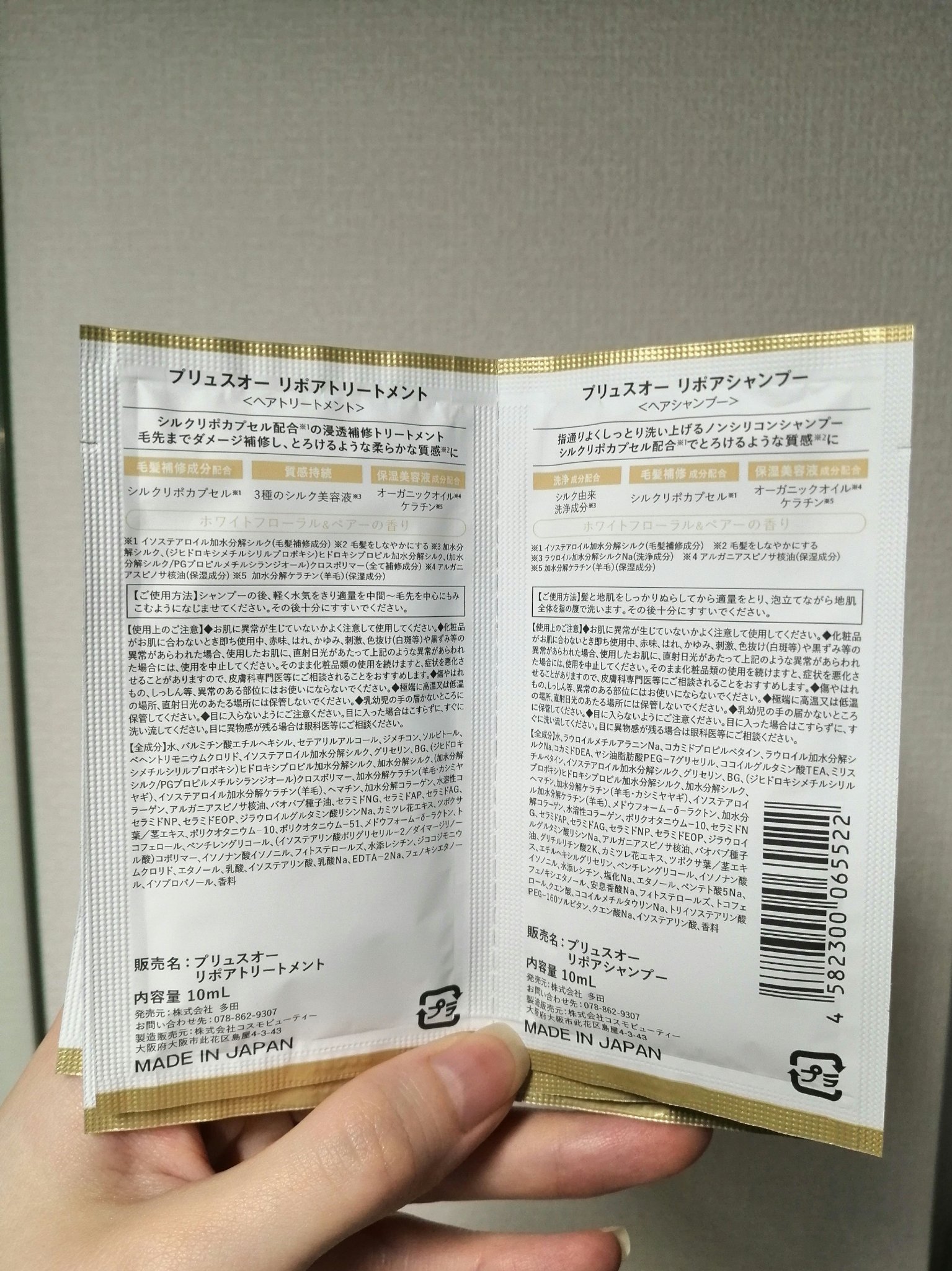 - <シャンプー本体> 水、ラウロイルメチルアラニンNa、コカミドプロピルベタイン、ラウロイル加水分解シルクNa、コカミドDEA、ヤシ油脂肪酸PEG-7グリセリル、ココイルグルタミン酸TEA、ミリスチルベタイン、イソステアロイル加水分解シルク、グリセリン、BG、(ジヒドロキシメチルシリルプロポキシ)ヒドロキシプロピル加水分解シルク、加水分解シルク、ヘマチン、加水分解ケラチン(羊毛・カシミヤヤギ)、イソステアロイル加水分解ケラチン(羊毛)、メドウフォーム-δ-ラクトン、加水分解コラーゲン、水溶性コラーゲン、ポリクオタニウム-10、セラミドNG、セラミドAP、セラミドAG、セラミドNP、セラミドEOP、ジラウロイルグルタミン酸リシンNa、アルガニアスピノサ核油、バオバブ種子油、グリチルリチン酸2K、カミツレ花エキス、ツボクサ葉/茎エキス、エチルヘキシルグリセリン、ペンチレングリコール、イソノナン酸イソノニル、水添レシチン、塩化Na、エタノール、ペンテト酸5Na、フェノキシエタノール、安息香酸Na、フィトステロールズ、トコフェロール、クエン酸、ココイルメチルタウリンNa、トリイソステアリン酸PEG-160ソルビタン、クエン酸Na、イソステアリン酸、香料 <トリートメント本体> 水、パルミチン酸エチルヘキシル、セテアリルアルコール、ジメチコン、ソルビトール、ベヘントリモニウムクロリド、イソステアロイル加水分解シルク、グリセリン、BG、(ジヒドロキシメチルシリルプロポキシ)ヒドロキシプロピル加水分解シルク、加水分解シルク、(加水分解シルク/PGプロピルメチルシランジオール)クロスポリマー、加水分解ケラチン(羊毛・カシミヤヤギ)、イソステアロイル加水分解ケラチン(羊毛)、ヘマチン、加水分解コラーゲン、水溶性コラーゲン、アルガニアスピノサ核油、バオバブ種子油、セラミドNG、セラミドAP、セラミドAG、セラミドNP、セラミドEOP、ジラウロイルグルタミン酸リシンNa、カミツレ花エキス、ツボクサ葉/茎エキス、ポリクオタニウム-10、ポリクオタニウム-51、メドウフォーム-δ-ラクトン、トコフェロール、ペンチレングリコール、(イソステアリン酸ポリグリセリル-2/ダイマージリノール酸)コポリマー、イソノナン酸イソノニル、フィトステロールズ、水添レシチン、ジココジモニウムクロリド、エタノール、乳酸、イソステアリン酸、乳酸Na、EDTA-2Na、フェノキシエタノール、イソプロパノール、香料 <シャンプー 詰替え> 水、ラウロイルメチルアラニンNa、コカミドプロピルベタイン、ラウロイル加水分解シルクNa、コカミドDEA、ヤシ油脂肪酸PEG-7グリセリル、ココイルグルタミン酸TEA、ミリスチルベタイン、イソステアロイル加水分解シルク、グリセリン、BG、(ジヒドロキシメチルシリルプロポキシ)ヒドロキシプロピル加水分解シルク、加水分解シルク、ヘマチン、加水分解ケラチン(羊毛・カシミヤヤギ)、イソステアロイル加水分解ケラチン(羊毛)、メドウフォーム-δ-ラクトン、加水分解コラーゲン、水溶性コラーゲン、ポリクオタニウム-10、セラミドNG、セラミドAP、セラミドAG、セラミドNP、セラミドEOP、ジラウロイルグルタミン酸リシンNa、アルガニアスピノサ核油、バオバブ種子油、グリチルリチン酸2K、カミツレ花エキス、ツボクサ葉/茎エキス、エチルヘキシルグリセリン、ペンチレングリコール、イソノナン酸イソノニル、水添レシチン、塩化Na、エタノール、ペンテト酸5Na、フェノキシエタノール、安息香酸Na、フィトステロールズ、トコフェロール、クエン酸、ココイルメチルタウリンNa、トリイソステアリン酸PEG-160ソルビタン、クエン酸Na、イソステアリン酸、香料 <トリートメント 詰替え> 水、パルミチン酸エチルヘキシル、セテアリルアルコール、ジメチコン、ソルビトール、ベヘントリモニウムクロリド、イソステアロイル加水分解シルク、グリセリン、BG、(ジヒドロキシメチルシリルプロポキシ)ヒドロキシプロピル加水分解シルク、加水分解シルク、(加水分解シルク/PGプロピルメチルシランジオール)クロスポリマー、加水分解ケラチン(羊毛・カシミヤヤギ)、イソステアロイル加水分解ケラチン(羊毛)、ヘマチン、加水分解コラーゲン、水溶性コラーゲン、アルガニアスピノサ核油、バオバブ種子油、セラミドNG、セラミドAP、セラミドAG、セラミドNP、セラミドEOP、ジラウロイルグルタミン酸リシンNa、カミツレ花エキス、ツボクサ葉/茎エキス、ポリクオタニウム-10、ポリクオタニウム-51、メドウフォーム-δ-ラクトン、トコフェロール、ペンチレングリコール、(イソステアリン酸ポリグリセリル-2/ダイマージリノール酸)コポリマー、イソノナン酸イソノニル、フィトステロールズ、水添レシチン、ジココジモニウムクロリド、エタノール、乳酸、イソステアリン酸、乳酸Na、EDTA-2Na、フェノキシエタノール、イソプロパノール、香料