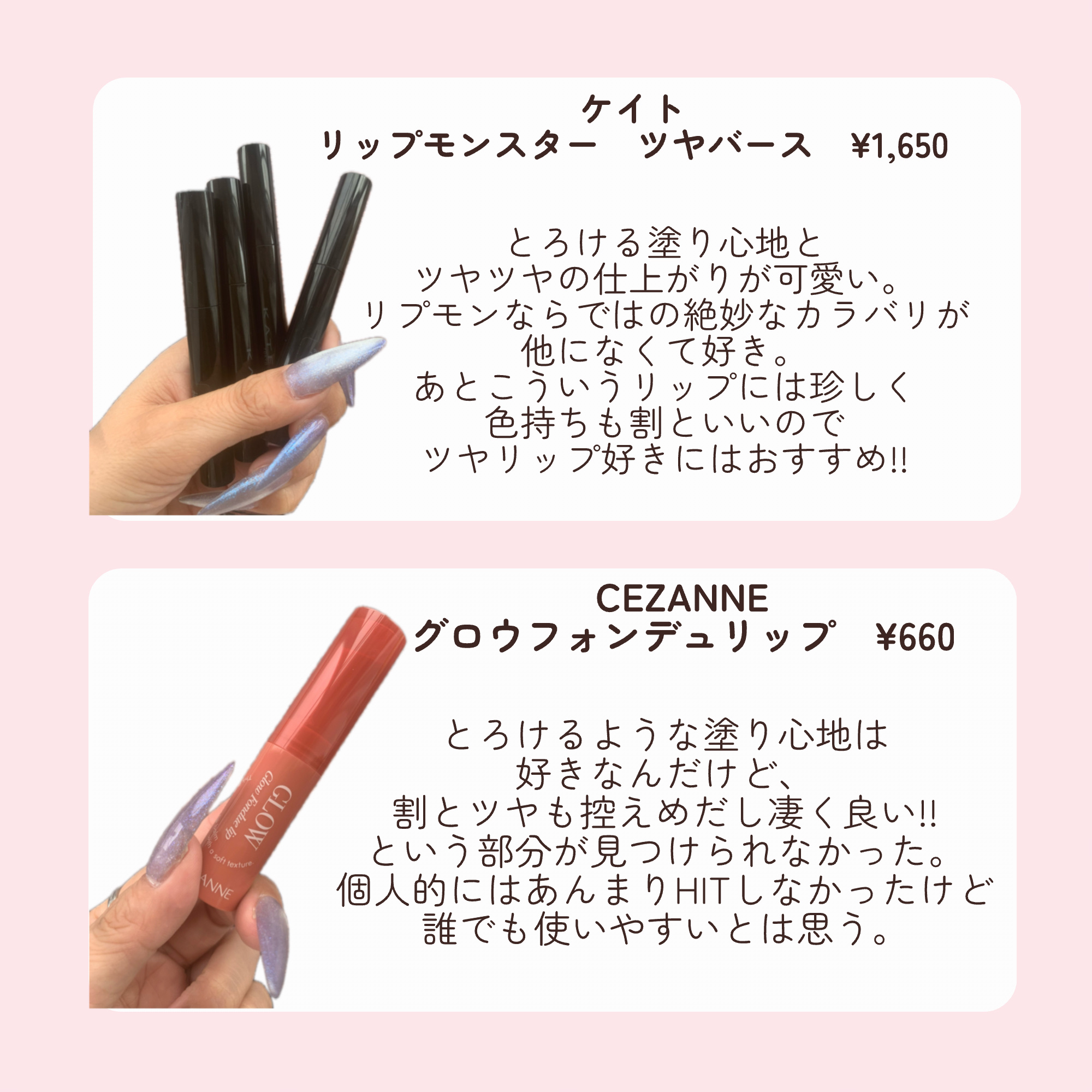 | 口紅・グロス・リップライナーランキング第67位 | 溶けるとオイルっぽいテクスチャーなのですが しっとり感がある割にサラッとしていて ベタつかないので使いやすい! | 詳細を見る | ||