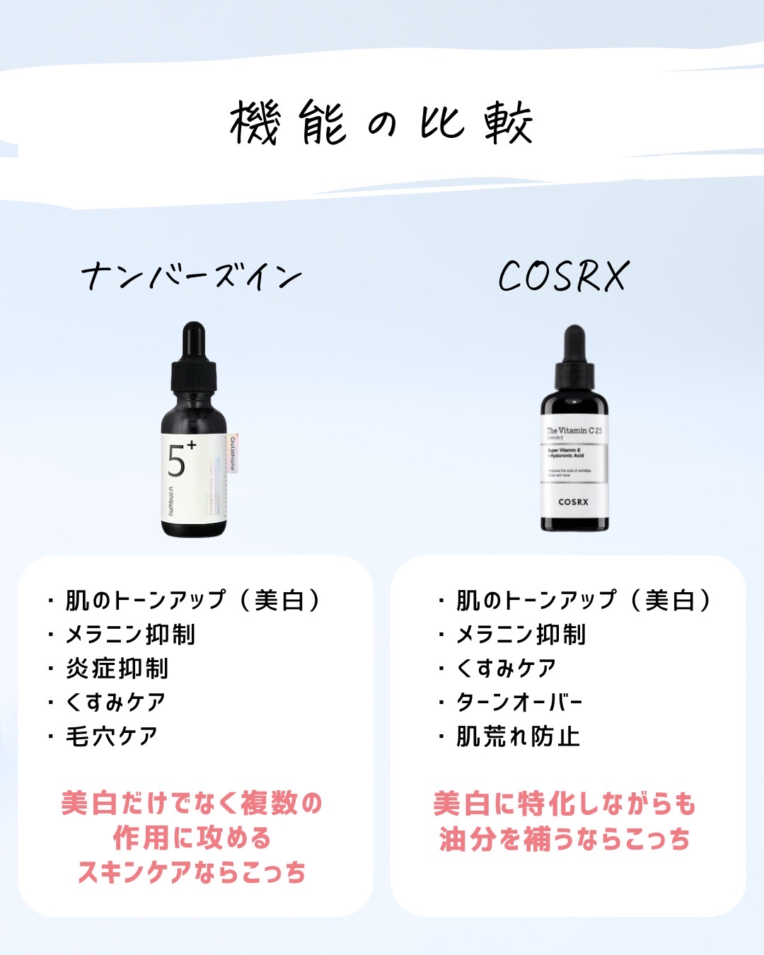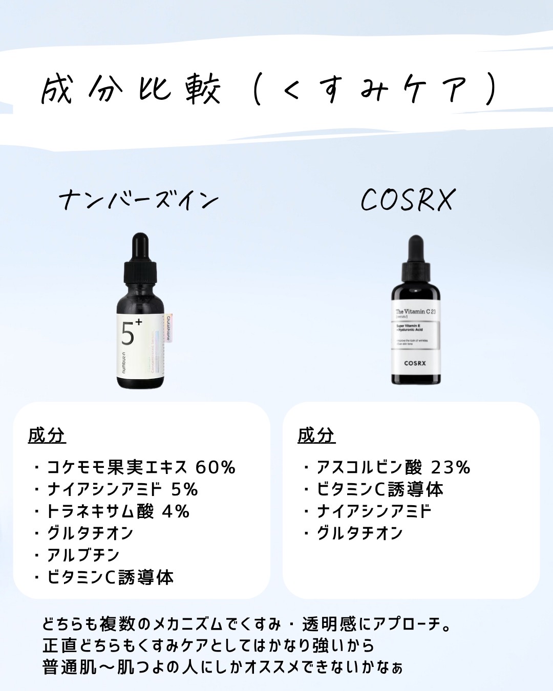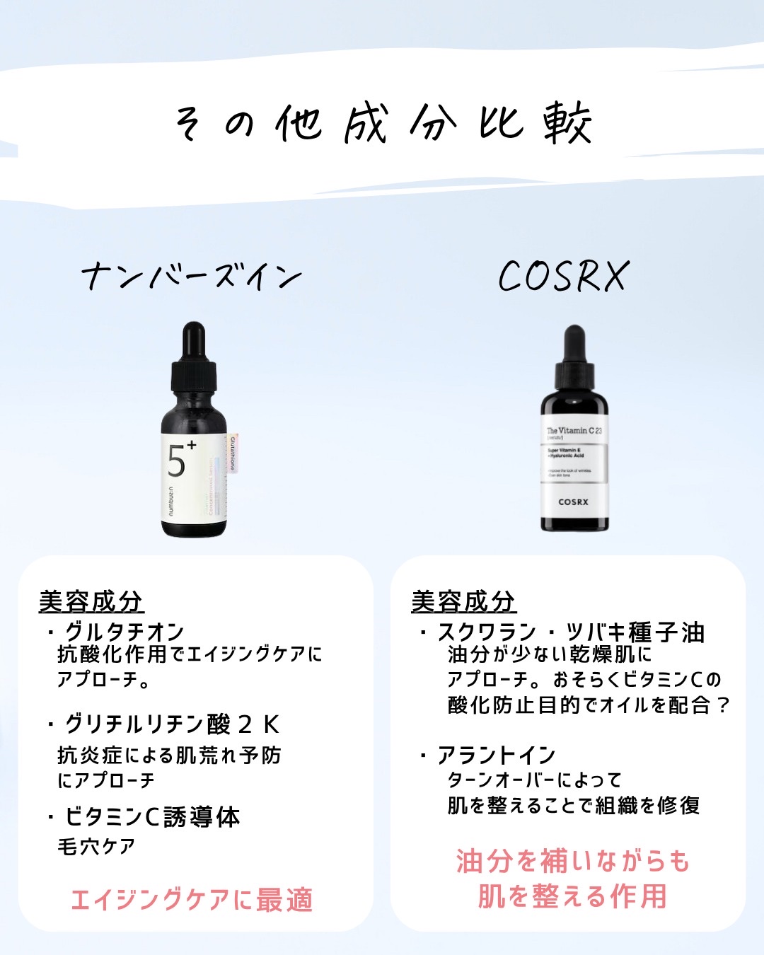特定の有効成分を試してみたい。美容成分を試したい。そんな時は代用してもいいけど、それって似てるのかな?って思うときが正直ある。 同じ成分があっても実は濃度が違ったり、処方技術が違ったり。技術が違うと使用感も剤型も変わることがあることは知ったうえで使うといいかも。 せっかくプチプラ化粧品を買うならそれはそれで楽しんでほしいから是非念頭にいれてほしいな!!
