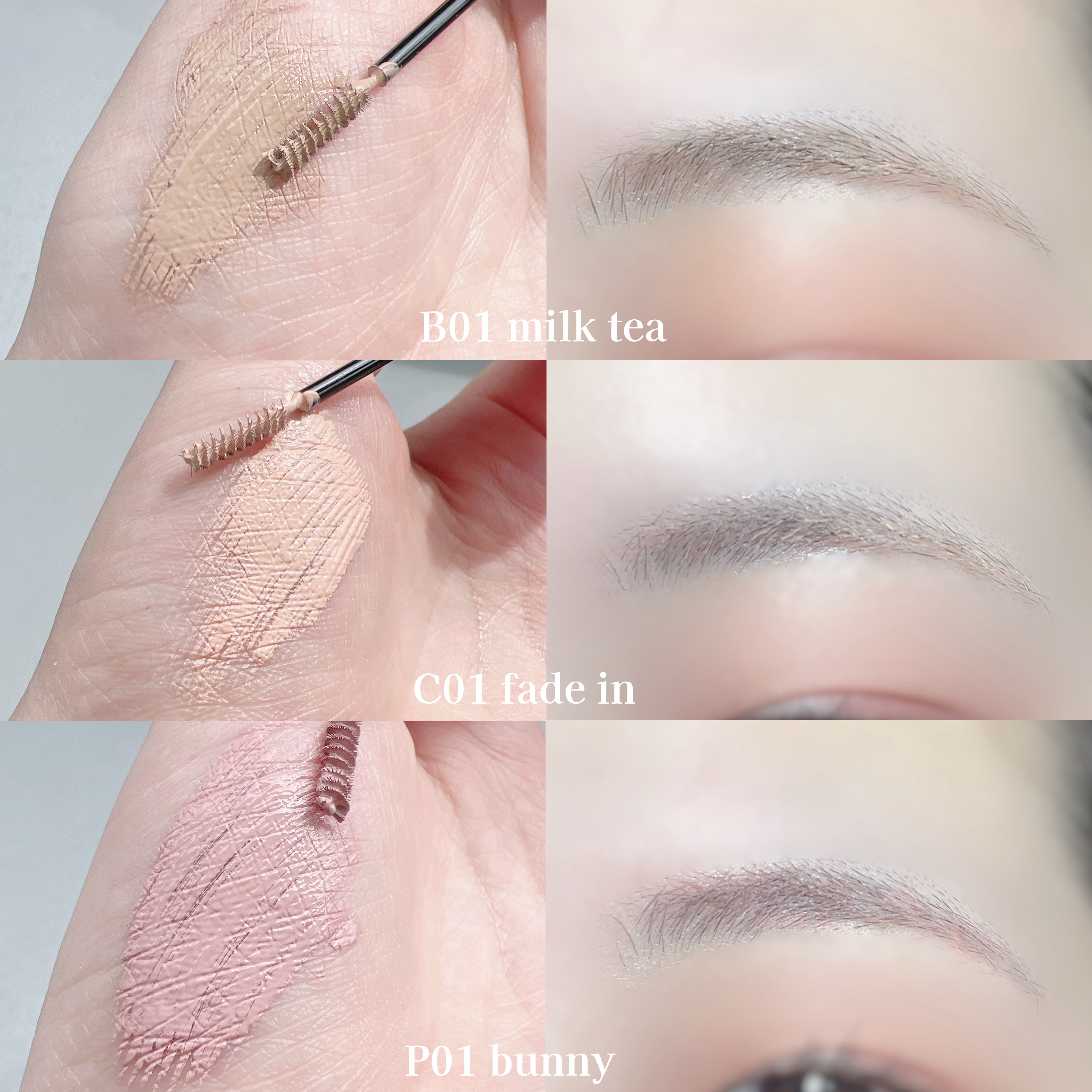 mudeインスパイアスキニーブロウカラB01ミルクティー一番明るいカラー、脱色した髪にC01フェードインブロウコンシーラー、カラーチェンジ前のベース用P01バニー雰囲気のある落ち着いたアッシュカラーモビッシュピンクミュート、アッシュ系のカラー...