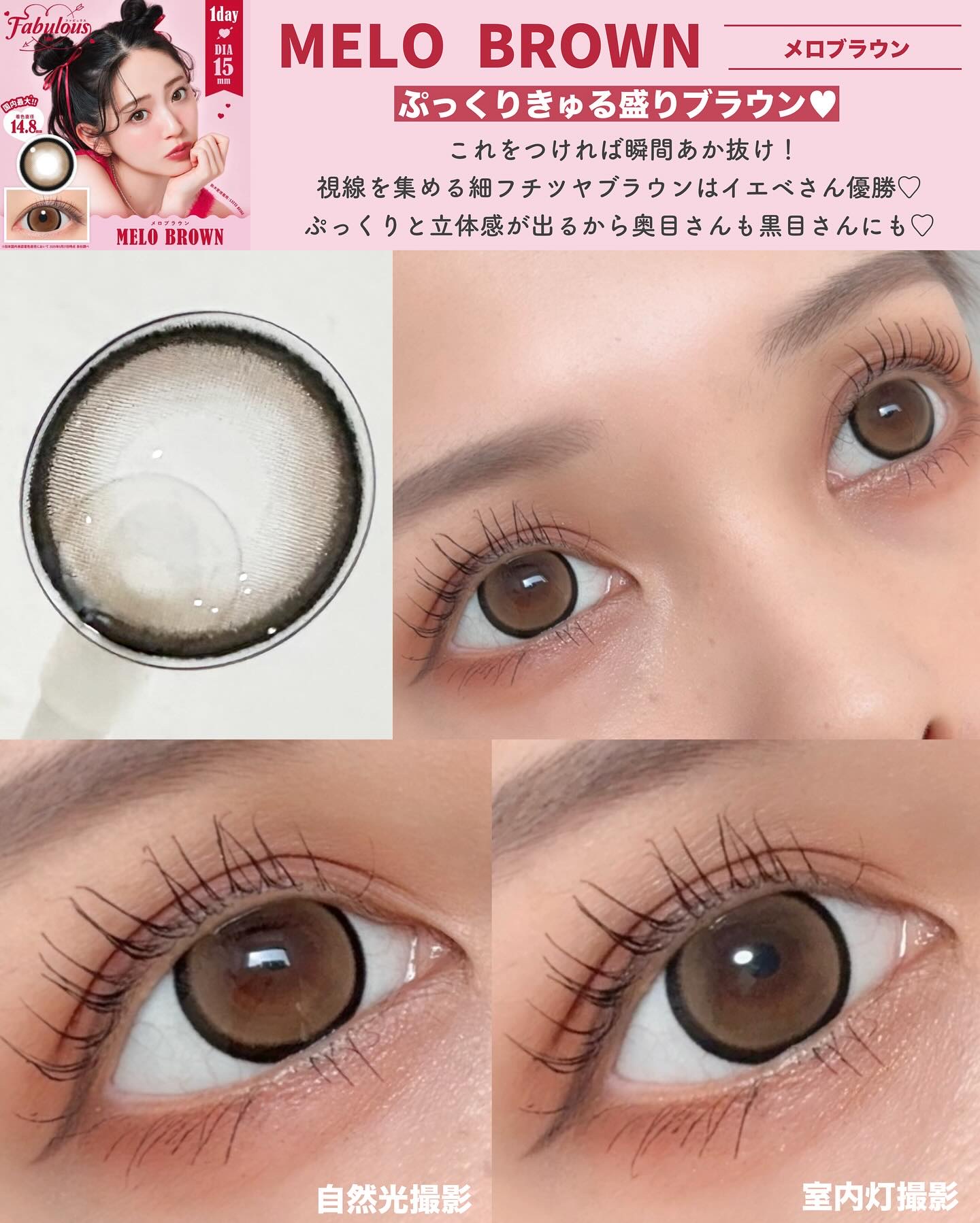 ちゅるんとしたデザインが可愛い太フチブラウンカラコン♡ 体感着色直径14.2mmくらいでとっても大きめサイズなので、すごく盛れましたᐡ ̳ᴗ ̫ ᴗ ̳ᐡ♡ 私のお気に入りはバニラブラウンです🍨うるうるしたナチュラルなデザインと甘めなふんわり太フチがとっても可愛いんです❤︎
