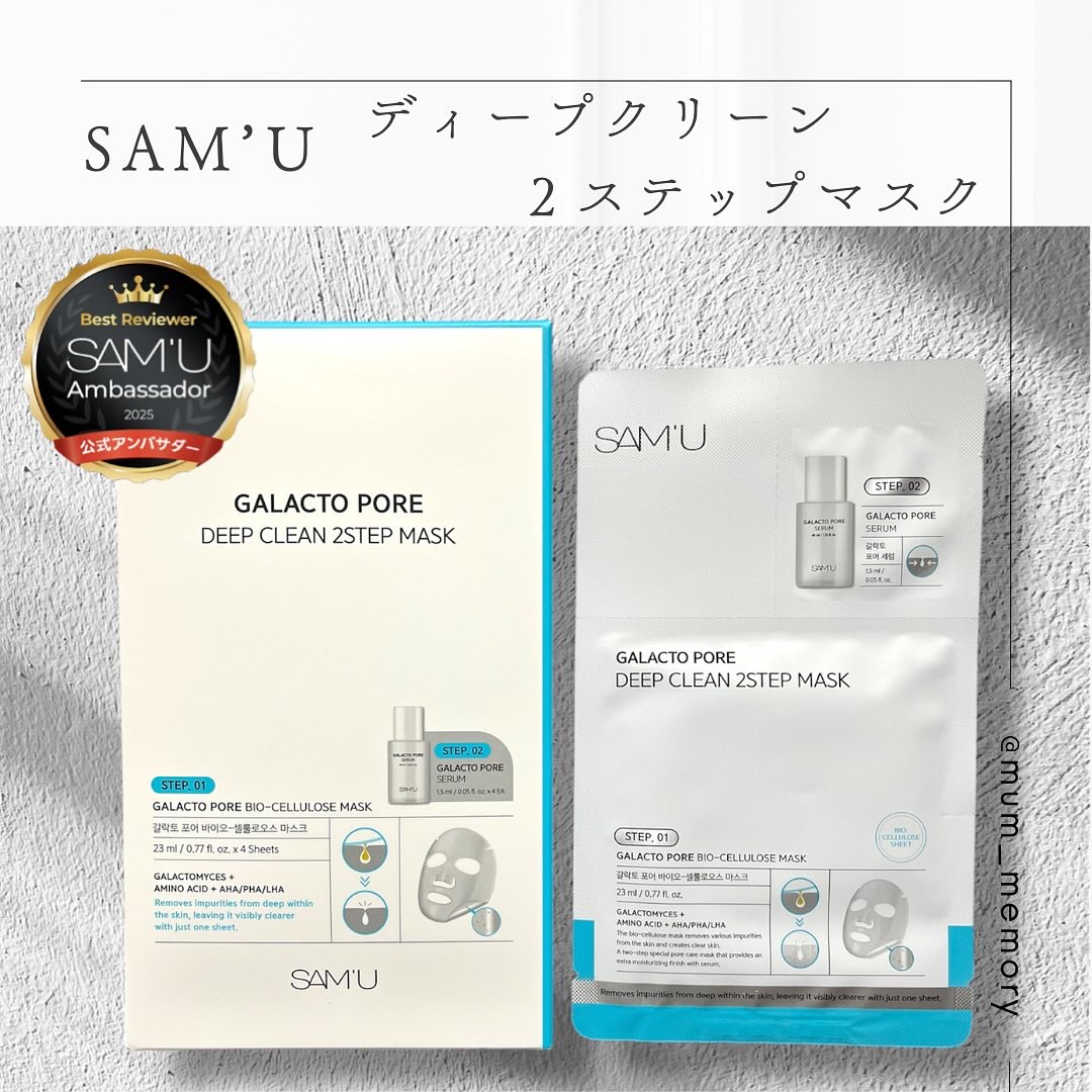 SAM'Uガラクトポアディープクリーン2ステップマスク¥2,200(税込)4枚入2ステップスペシャルケアマスク🩷30分から50分シートマスクをつけて浸透させてから剥がすと老廃物も一緒に除去してくれる!!メッシュが両面についてるので剥がしてから...