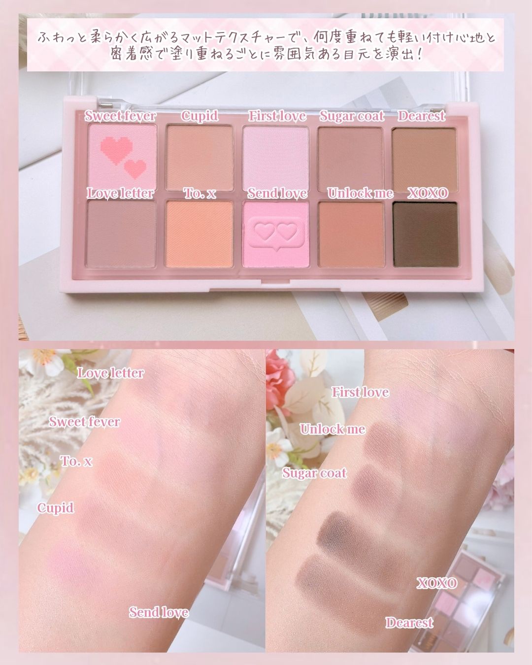 - 10color & 5texteresで、多機能に使用できるアイシャドウパレットです。 陰影ベースからパール感のあるポイントメイクまで、滑らかな塗り心地と高い密着力で美しいグラデーションを作ることができます。 しっとりとした目元を演出しつつ煌めきも与え自分だけのmoodを演出してくれます。