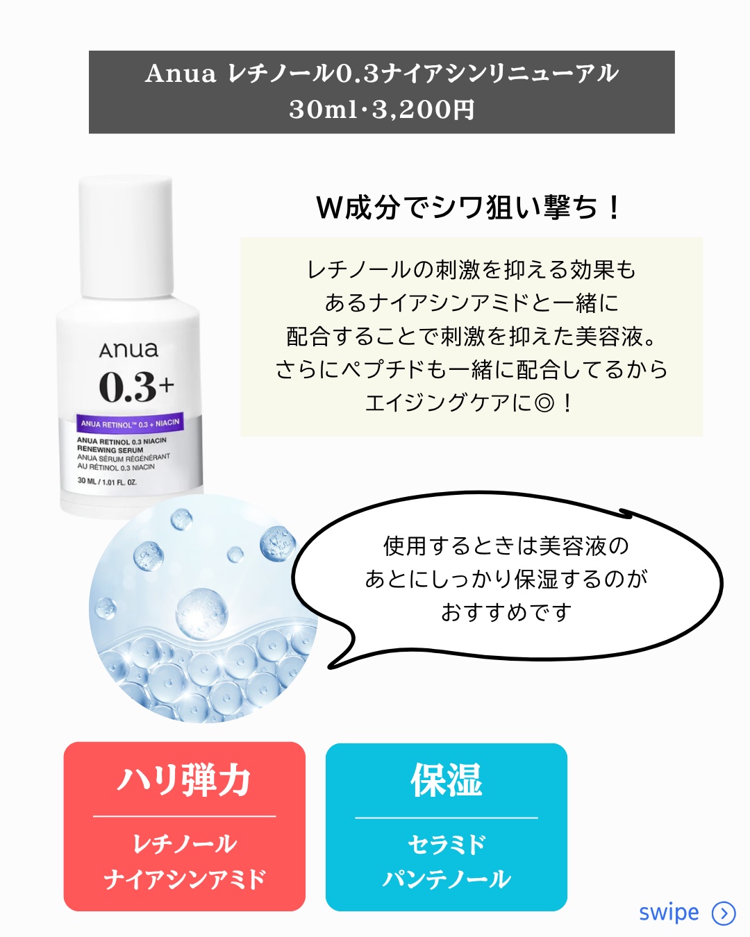 Anua レチノール0.3 ナイアシンリニューイングセラム | 3,200円 |