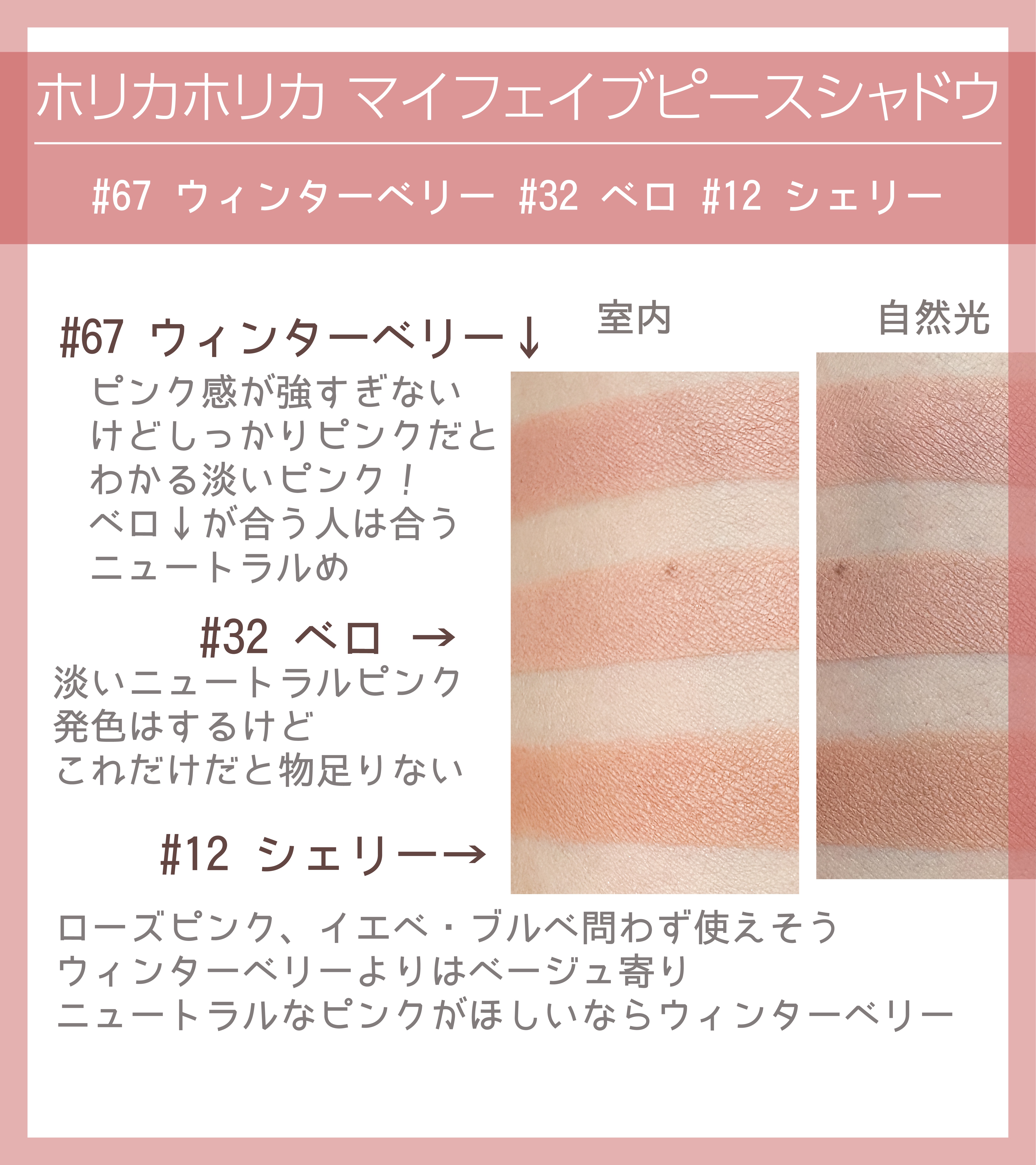 ✎*。HOLIKAHOLIKA└マイフェイブピースシャドウ◾︎color#12シェリー#22ベベ#32ベロピンク系の単色アイシャドウ比較儚い系メイクにも使えそうなカラー🩰✨ラメは上品なツヤ感でかわいい(тт)ブルベ/イエベ問わず使えそう◎次の...