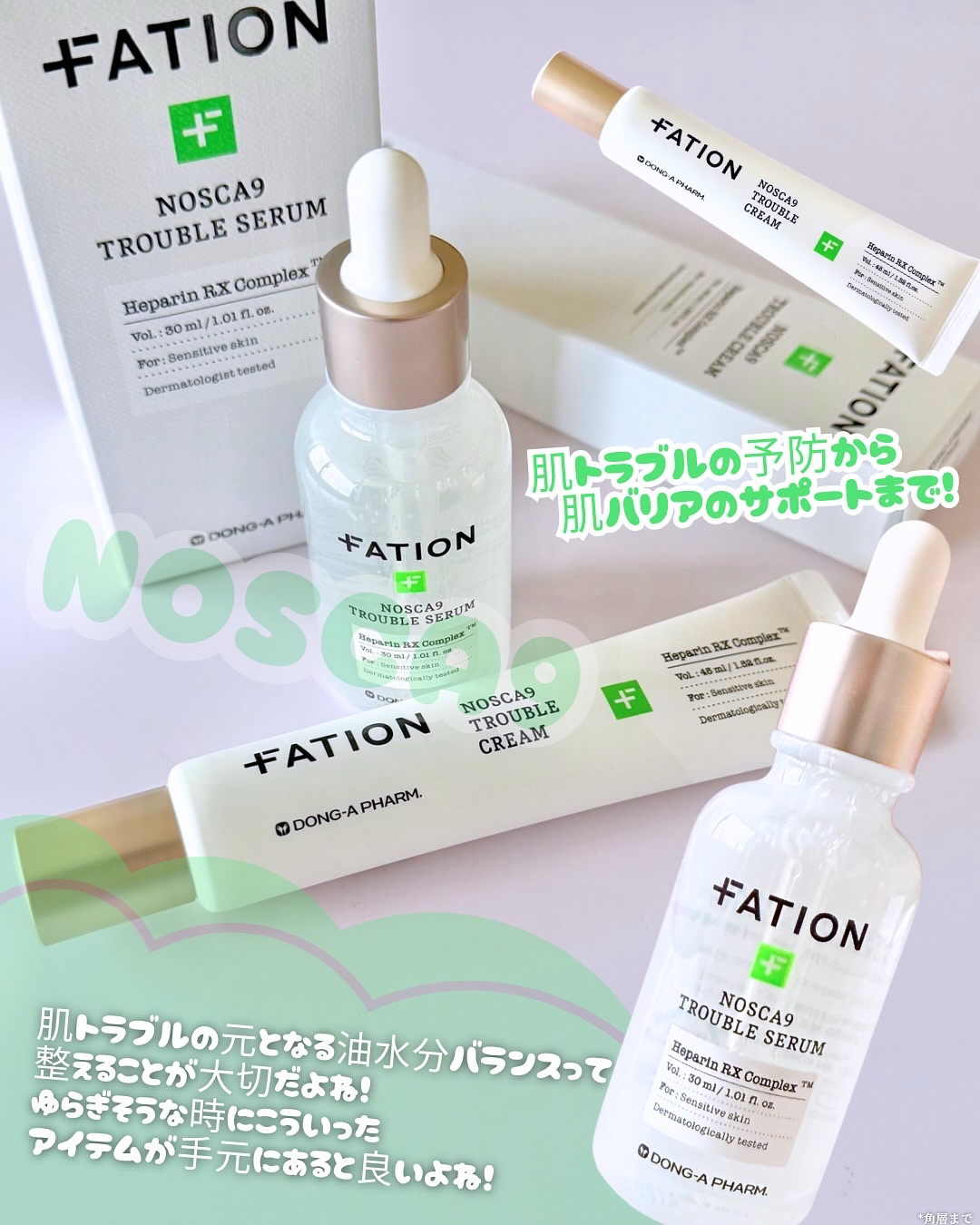 #FATION#ノスカナイントラブルセラム#ノスカナイントラブルクリーム#提供90年を超える韓国TOPの製薬会社の東亜製薬で9年間研究開発して作られたFATION(パティオン)のノスカナインラインです💚🌿パッケージが爽やかでオシャレです♡ニキ...