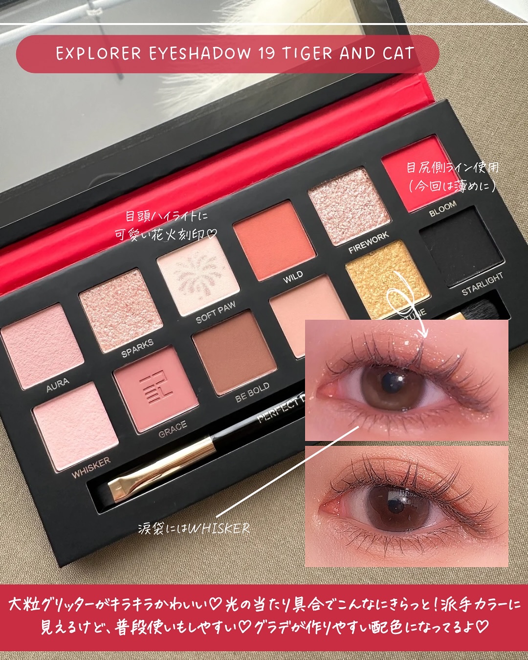 夏花火パレット🎇虎と黒猫🐅🐈⬛パーフェクトダイアリーエクスプローラー12色アイシャドウパレット虎&猫大人気動物パレットから夏花火にぴったりな新色パレット登場🎇虎と黒猫猫の二つの表情になれる💫右側は赤や黒、ゴールドラメで派手にみえるけどポイン...
