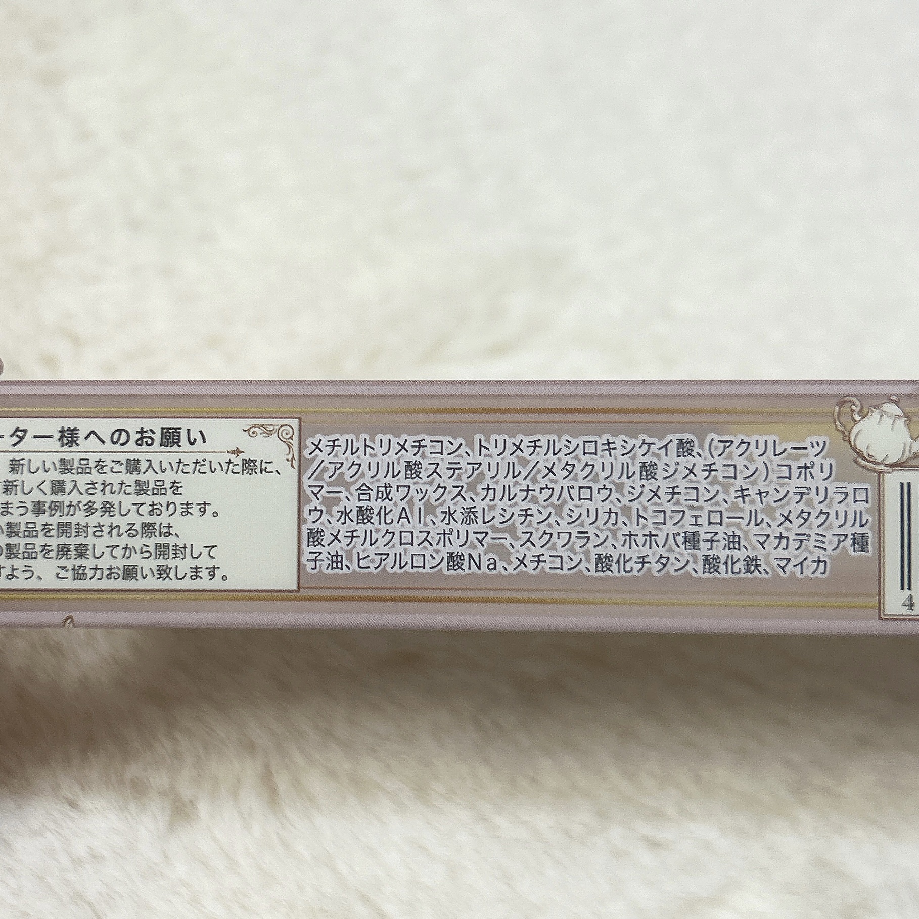 - <01 ディープブラック> メチルトリメチコン、トリメチルシロキシケイ酸、(アクリレーツ/アクリル酸ステアリル/メタクリル酸ジメチコン)コポリマー、ポリエチレン、カルナウバロウ、キャンデリラロウ、ジメチコン、水添レシチン、シリカ、メタクリル酸メチルクロスポリマー、トコフェロール、スクワラン、ホホバ種子油、マカデミア種子油、ヒアルロン酸Na、メチコン、(+/-)水酸化Al、酸化鉄、マイカ、酸化チタン <02 ミディアムブラウン> メチルトリメチコン、トリメチルシロキシケイ酸、(アクリレーツ/アクリル酸ステアリル/メタクリル酸ジメチコン)コポリマー、ポリエチレン、カルナウバロウ、キャンデリラロウ、ジメチコン、水添レシチン、シリカ、メタクリル酸メチルクロスポリマー、トコフェロール、スクワラン、ホホバ種子油、マカデミア種子油、ヒアルロン酸Na、メチコン、(+/-)水酸化Al、酸化鉄、マイカ、酸化チタン <03 ダークブラウン> メチルトリメチコン、トリメチルシロキシケイ酸、(アクリレーツ/アクリル酸ステアリル/メタクリル酸ジメチコン)コポリマー、ポリエチレン、カルナウバロウ、スクワラン、ジメチコン、水添レシチン、シリカ、トコフェロール、メタクリル酸メチルクロスポリマー、キャンデリラロウ、ホホバ種子油、マカデミア種子油、ヒアルロン酸Na、メチコン、水酸化Al、酸化鉄、酸化チタン、マイカ <04 ガーネットバーガンディ> メチルトリメチコン、トリメチルシロキシケイ酸、(アクリレーツ/アクリル酸ステアリル/メタクリル酸ジメチコン)コポリマー、ポリエチレン、カルナウバロウ、ジメチコン、キャンデリラロウ、水添レシチン、シリカ、トコフェロール、メタクリル酸メチルクロスポリマー、スクワラン、ホホバ種子油、マカデミア種子油、ヒアルロン酸Na、メチコン、水酸化Al、酸化鉄、グンジョウ、酸化チタン、マイカ <06 フォギープラム> メチルトリメチコン、トリメチルシロキシケイ酸、(アクリレーツ/アクリル酸ステアリル/メタクリル酸ジメチコン)コポリマー、ポリエチレン、カルナウバロウ、ジメチコン、キャンデリラロウ、水酸化Al、水添レシチン、シリカ、トコフェロール、メタクリル酸メチルクロスポリマー、スクワラン、ホホバ種子油、マカデミア種子油、ヒアルロン酸Na、メチコン、酸化鉄、グンジョウ、酸化チタン、マイカ <07 アズキブラウン> メチルトリメチコン、トリメチルシロキシケイ酸、(アクリレーツ/アクリル酸ステアリル/メタクリル酸ジメチコン)コポリマー、ポリエチレン、カルナウバロウ、キャンデリラロウ、ジメチコン、水添レシチン、シリカ、トコフェロール、メタクリル酸メチルクロスポリマー、スクワラン、ホホバ種子油、マカデミア種子油、水酸化Al、ハイドロゲンジメチコン、ヒアルロン酸Na、メチコン、酸化鉄、グンジョウ、マイカ、酸化チタン <09 ダージリンピンク> メチルトリメチコン、トリメチルシロキシケイ酸、(アクリレーツ/アクリル酸ステアリル/メタクリル酸ジメチコン)コポリマー、合成ワックス、カルナウバロウ、キャンデリラロウ、ジメチコン、水酸化Al、ハイドロゲンジメチコン、水添レシチン、シリカ、トコフェロール、メタクリル酸メチルクロスポリマー、スクワラン、ホホバ種子油、マカデミア種子油、ヒアルロン酸Na、メチコン、酸化鉄、酸化チタン、マイカ、グンジョウ <11 クラウディーグレー> メチルトリメチコン、トリメチルシロキシケイ酸、(アクリレーツ/アクリル酸ステアリル/メタクリル酸ジメチコン)コポリマー、合成ワックス、カルナウバロウ、ジメチコン、キャンデリラロウ、水酸化Al、水添レシチン、シリカ、トコフェロール、メタクリル酸メチルクロスポリマー、ハイドロゲンジメチコン、スクワラン、ホホバ種子油、マカデミア種子油、ヒアルロン酸Na、メチコン、酸化鉄、酸化チタン、マイカ <15 カプチーノピンク> メチルトリメチコン、トリメチルシロキシケイ酸、(アクリレーツ/アクリル酸ステアリル/メタクリル酸ジメチコン)コポリマー、合成ワックス、カルナウバロウ、ジメチコン、キャンデリラロウ、水酸化Al、水添レシチン、シリカ、トコフェロール、メタクリル酸メチルクロスポリマー、スクワラン、ホホバ種子油、マカデミア種子油、ヒアルロン酸Na、メチコン、酸化チタン、酸化鉄、マイカ <05 ビターキャラメル> メチルトリメチコン、トリメチルシロキシケイ酸、(アクリレーツ/アクリル酸ステアリル/メタクリル酸ジメチコン)コポリマー、ポリエチレン、カルナウバロウ、ジメチコン、キャンデリラロウ、水添レシチン、シリカ、トコフェロール、メタクリル酸メチルクロスポリマー、スクワラン、ホホバ種子油、マカデミア種子油、ヒアルロン酸Na、メチコン、水酸化Al、酸化鉄、マイカ、酸化チタン <08 マッチャカーキ> メチルトリメチコン、トリメチルシロキシケイ酸、(アクリレーツ/アクリル酸ステアリル/メタクリル酸ジメチコン)コポリマー、合成ワックス、