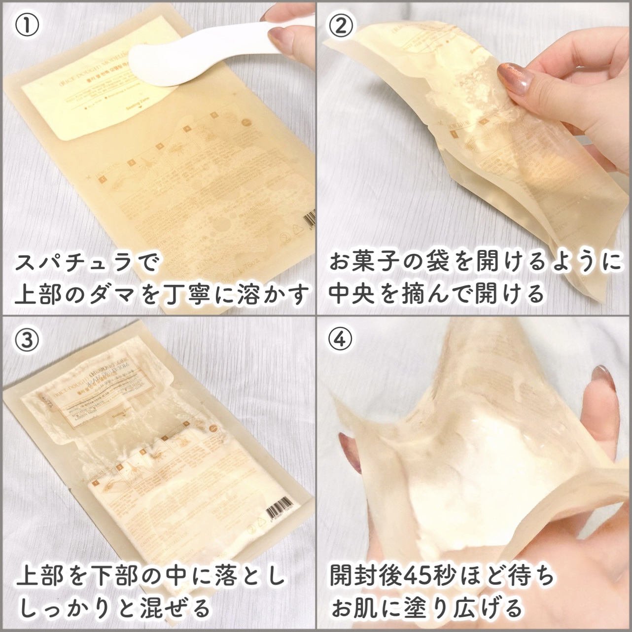 - 天然原料の米で作られた 米モデリングマスク 他の道具がなくても手軽で、顔に残る残渣がなく、量を調節しやすいモデリングマスク 水は必要ない、マスクの中にある米ぬか水(保湿)を利用して潤いたっぷり入ったマスクパック。 クールな使用感&保湿&整肌&ハリ効果 人工香料無添加で肌にやさしい使い心地。